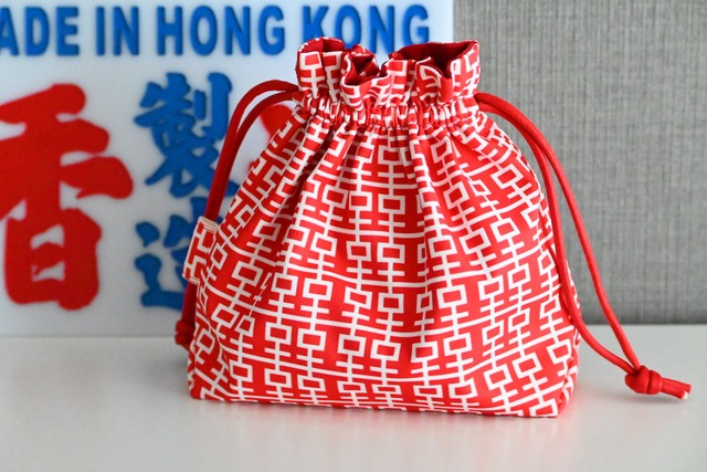 【再入荷しました!】 香港の生地で作った巾着 ダブルハピネス柄