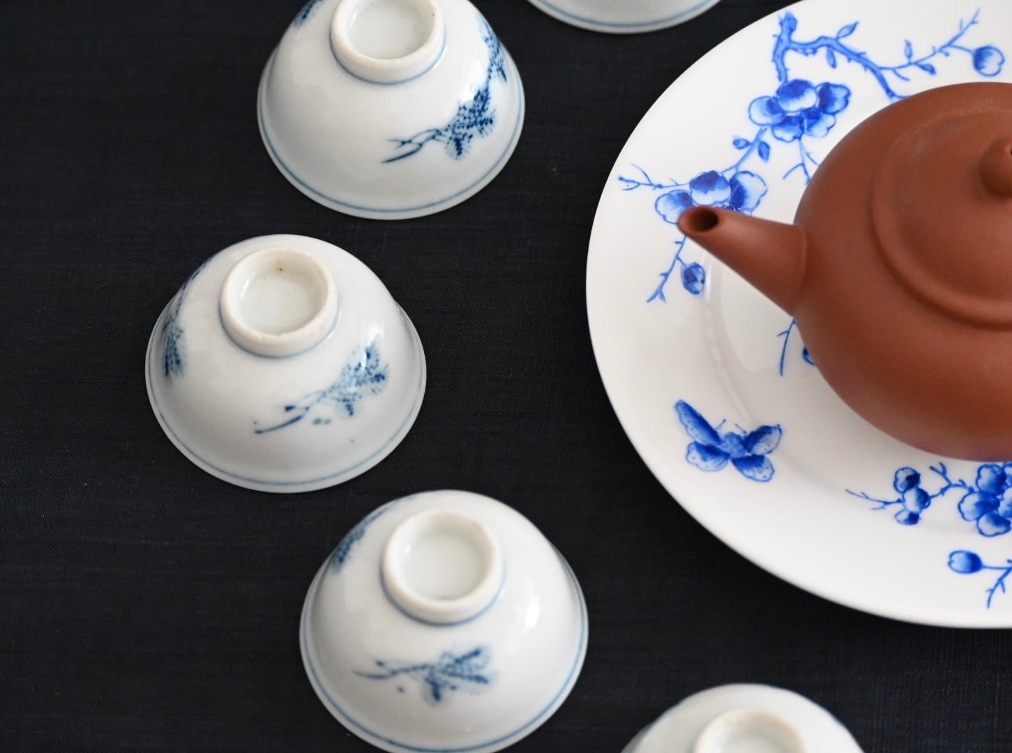 側面2箇所に描かれた松の葉の絵柄がさりげなく上品で、表面の上部・下部二箇所に引かれた線も美しいおちょこ。 線はよく見ると、きっと手で引かれたのだろうなと感じられる形跡があり、それにもまた心惹かれます。 ひとつひとつ触ってゆくとほんの少しずつ釉薬の感じが異なり、少し厚く感じるもの・薄く感じるものがあるのも、ものづくりの過程に思いを馳せられて気に入っています。 サイズ的に中国茶の茶杯として使うのにもピッタリです。控えめな柄の器ですので、お手持ちの茶器などとの組み合わせも楽しんでいただけるかと思います。 当店で取り扱っております香港の手描きの器や茶壺などともとても相性が良いです(最後の写真)。 内側、側面ともに、うっすらと青の塗料の点が見られるものがあったり、小さな点があるもの、底面に小さな凹凸が見られるものもございます。 絵柄の色の濃さもそれぞれです。 古いものですので多少の汚れがあるものもございます。ご理解ご了承をお願いいたします。 価格は1セット(おちょこふたつ)あたりのお値段です。 ※3個以上の奇数でのお求めをご希望の方、お受けできる場合もございますのでお問い合わせください。 写真に写っておりますおちょこ以外のものは撮影用です。 【大きさ】 高さ 約2.6cm 直径 約5.5cm 重さ 約30〜35g ※多少の個体差あり 容量 約26㏄(満タン) 容量 約15㏄(実用) ※ご覧いただいている商品の写真につきましては、できるだけ実物に近いように努めておりますが、光の当たり具合やお使いの環境(モニター、ブラウザ等)により、見え方が実物と若干異なる場合がございます。あらかじめご了承ください。
