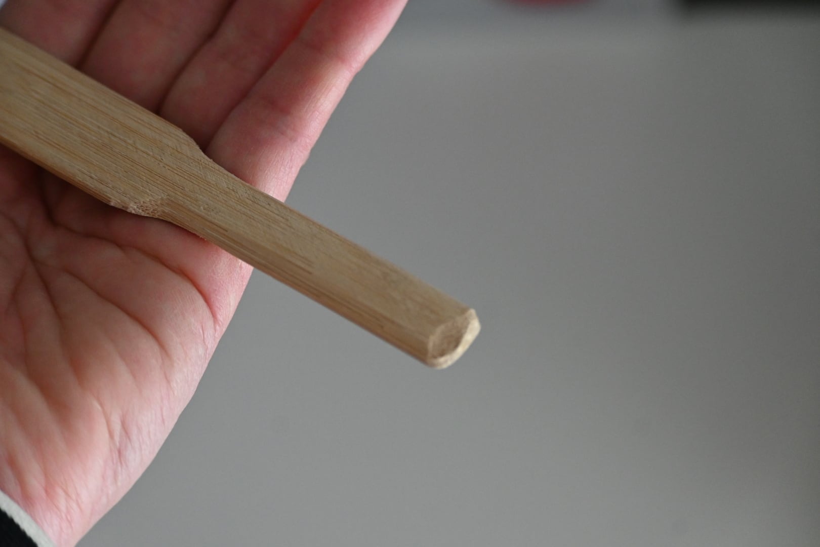 2サイズ持ち帰ってきましたが、こちらの小サイズは手のひらにすっぽり収まる大きさ。全体が綺麗にやすりがけされていて、餃子や飲茶の具を掬う先の部分に向かって斜めに少し削られており、先部分が他の部分にくらべ薄くなっています。具が掬いやすくて本当に有能な道具で、愛されるのには理由があると思わせられる素晴らしい道具です。