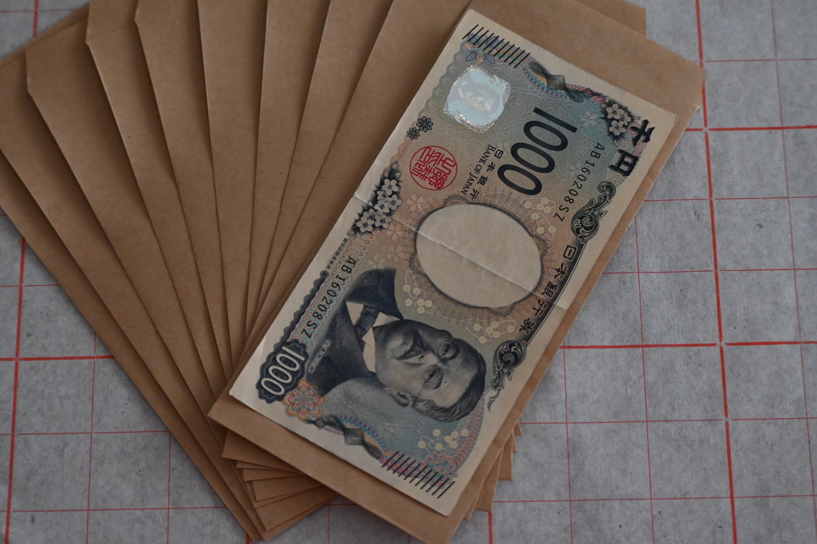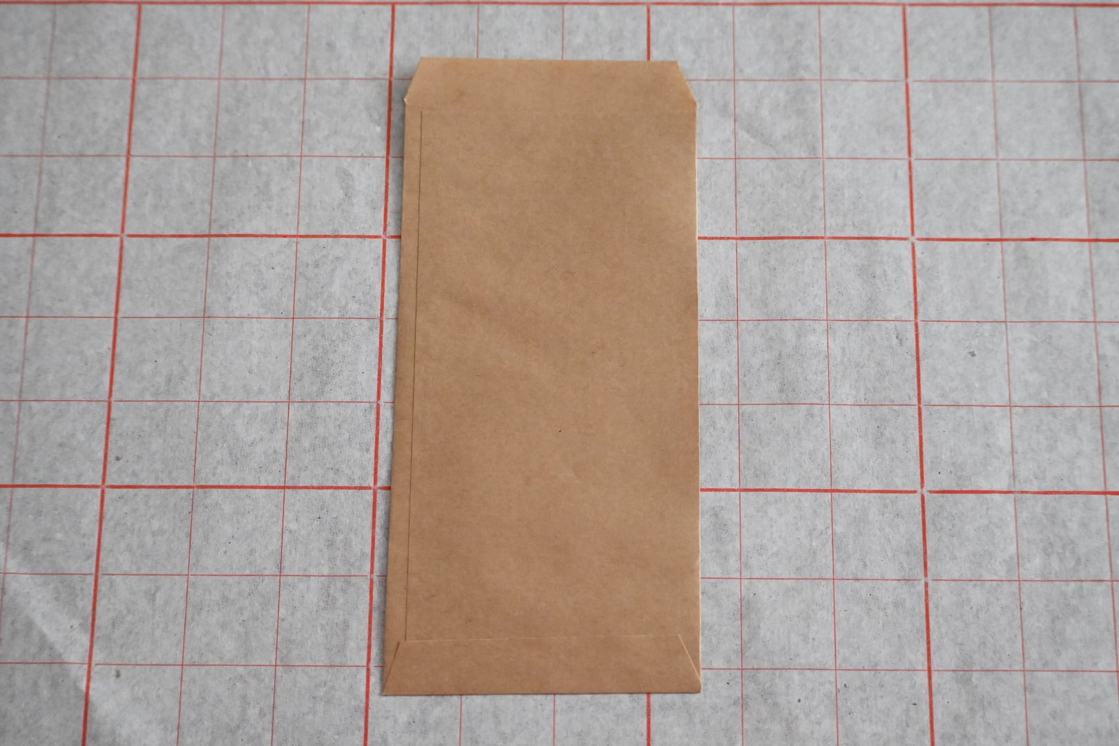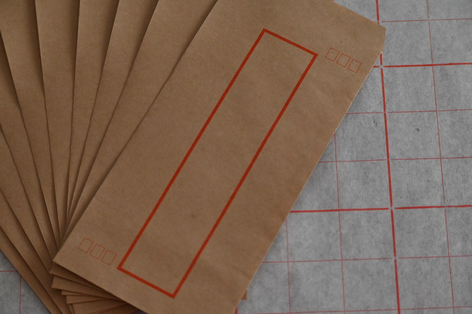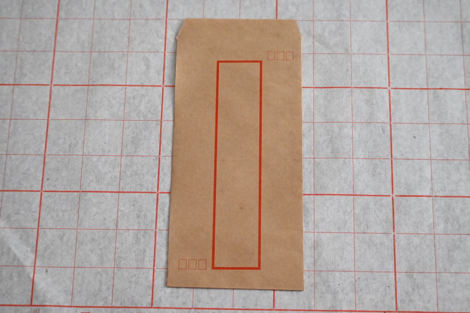 日本の茶封筒より少し色は濃いめ。真ん中に太めの赤線で枠。そして右斜め上・左斜め下に小さな四角い枠がそれぞれ3つ並びます。