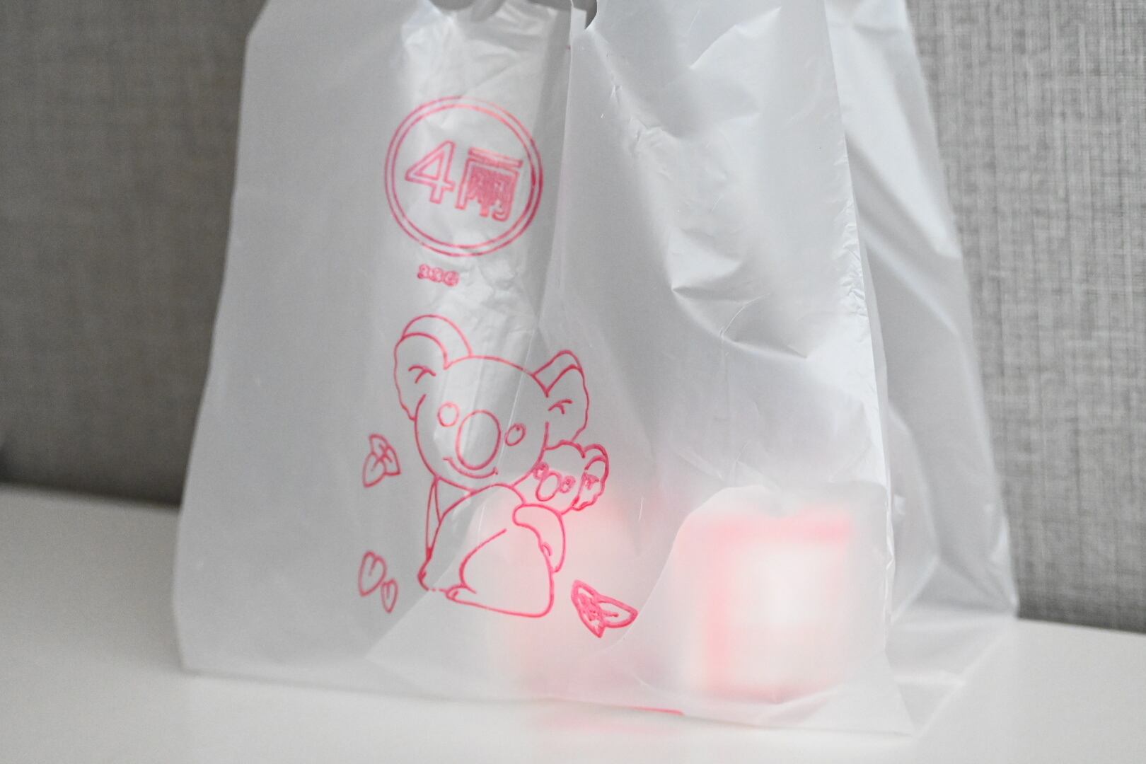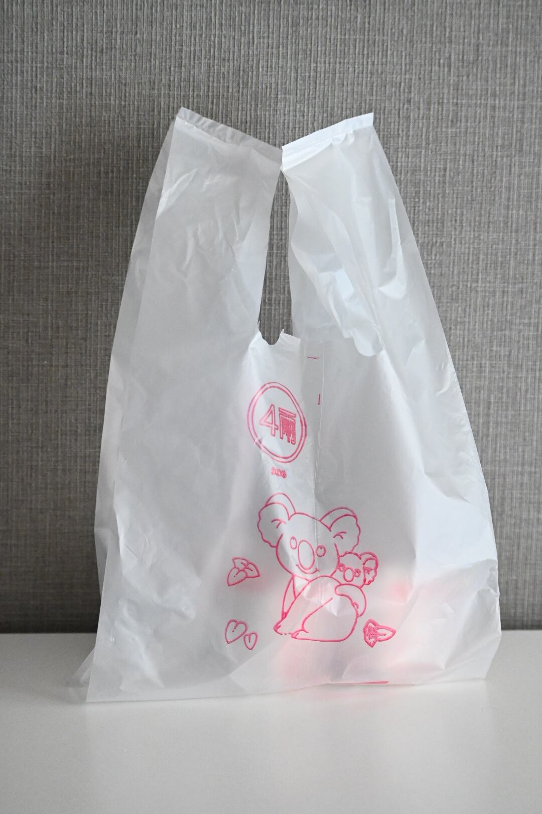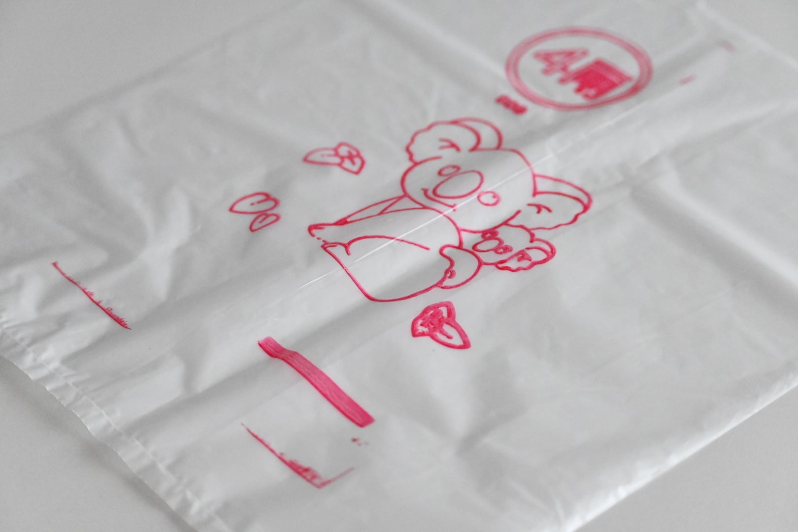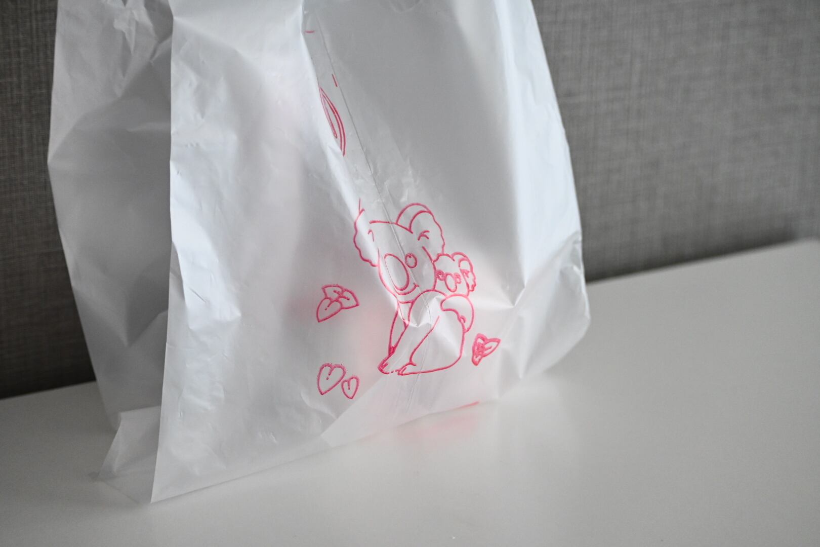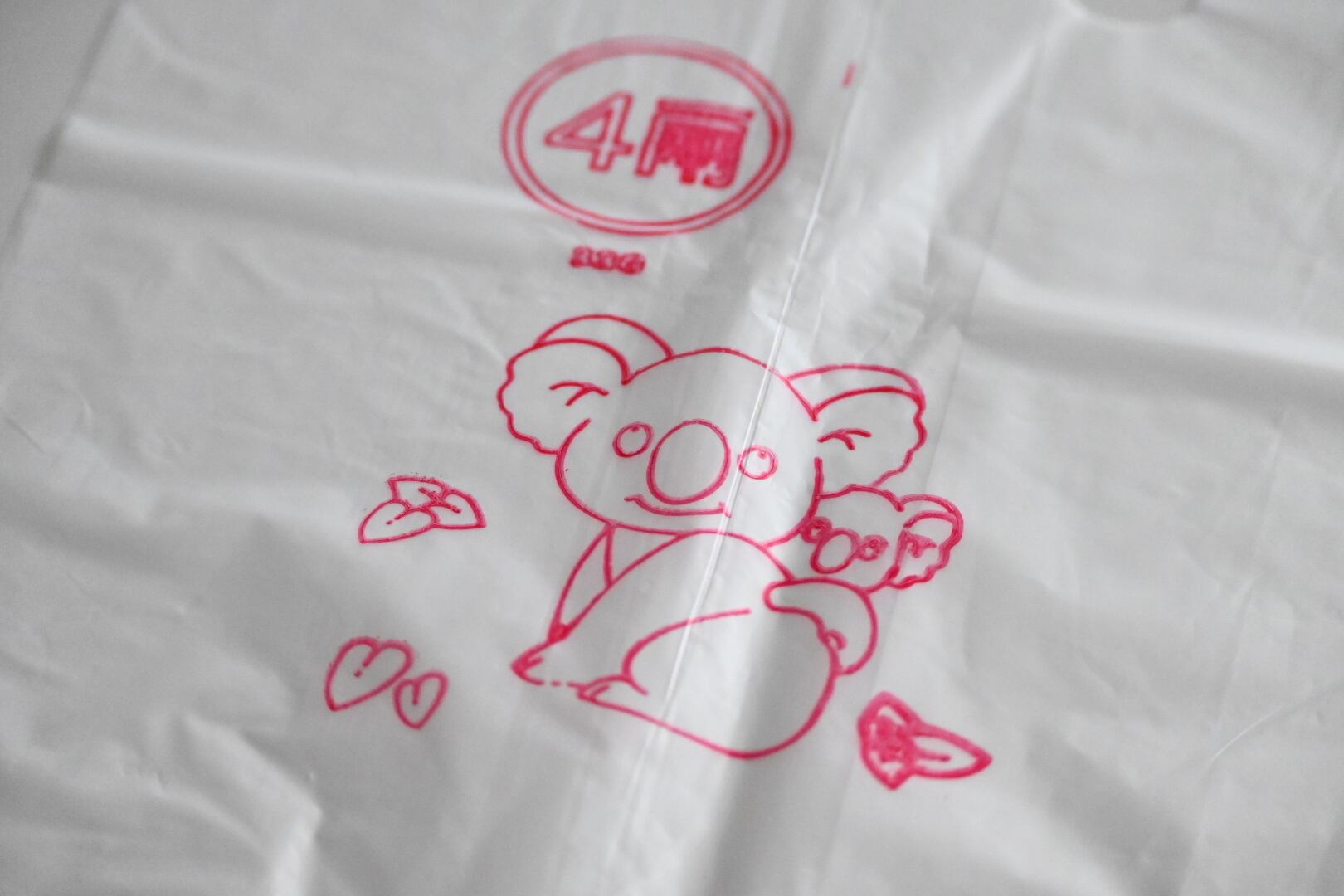 台南で見つけた、メイドイン台南の半透明のビニール袋。こちらはコアラの親子と葉っぱが描かれているもの。