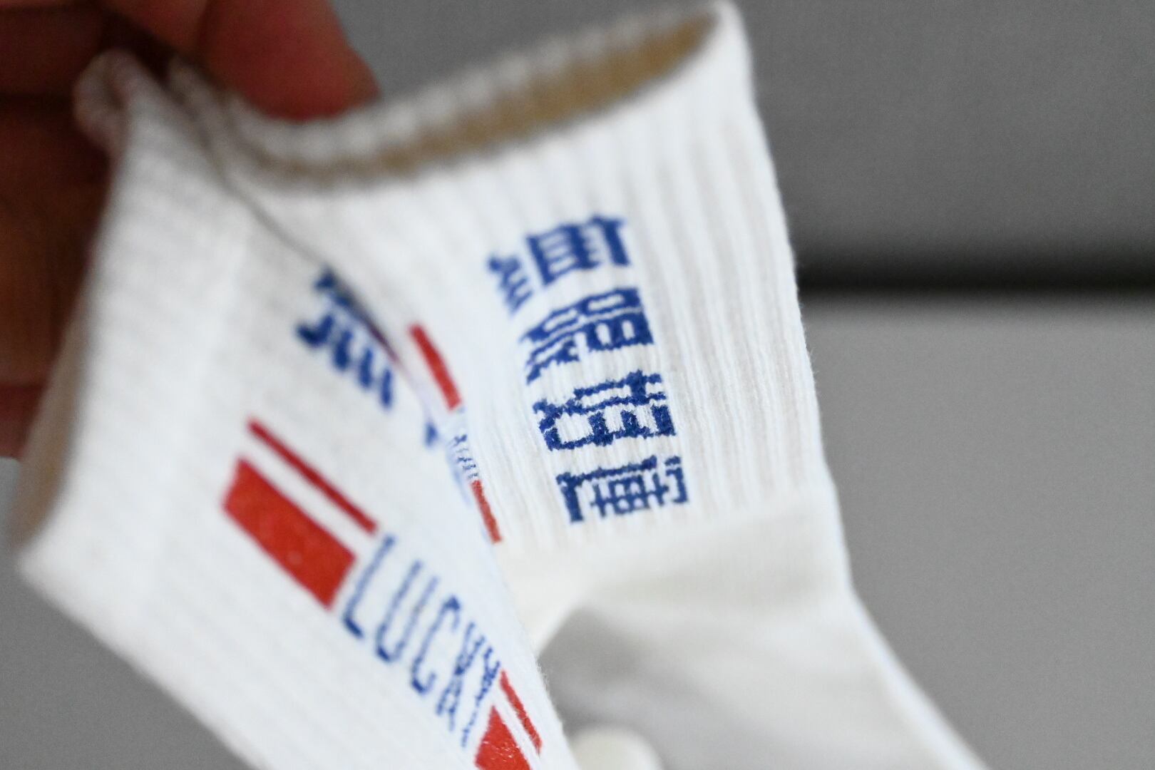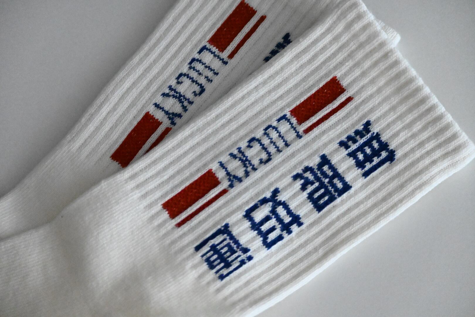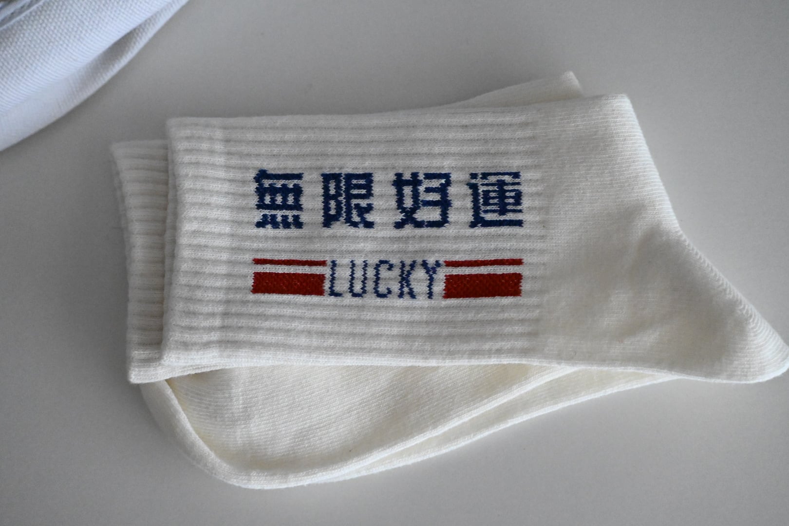 【無限好運 LUCKY】という、履いたらなんだか良いことがありそうなメッセージが書かれた靴下。