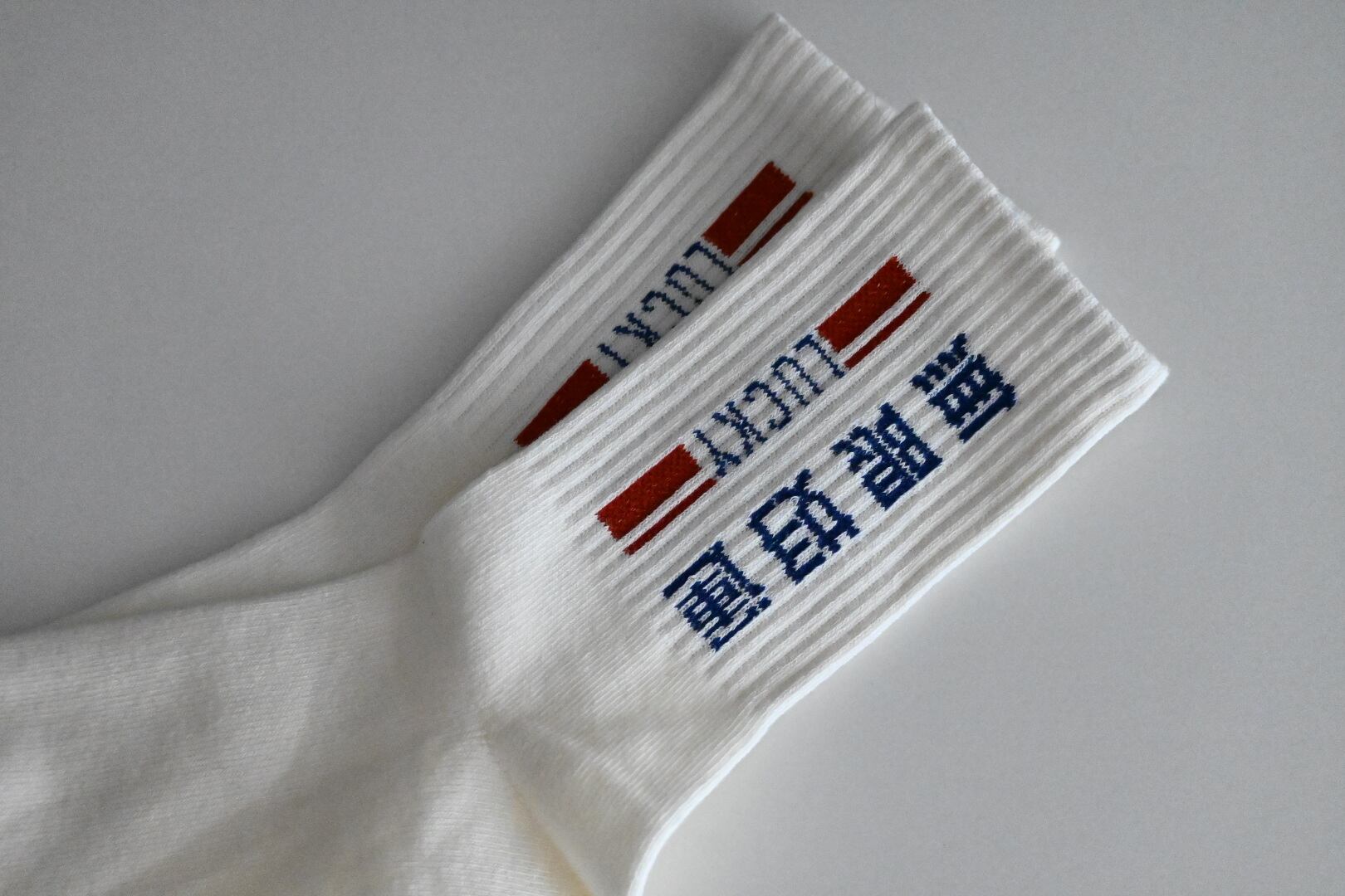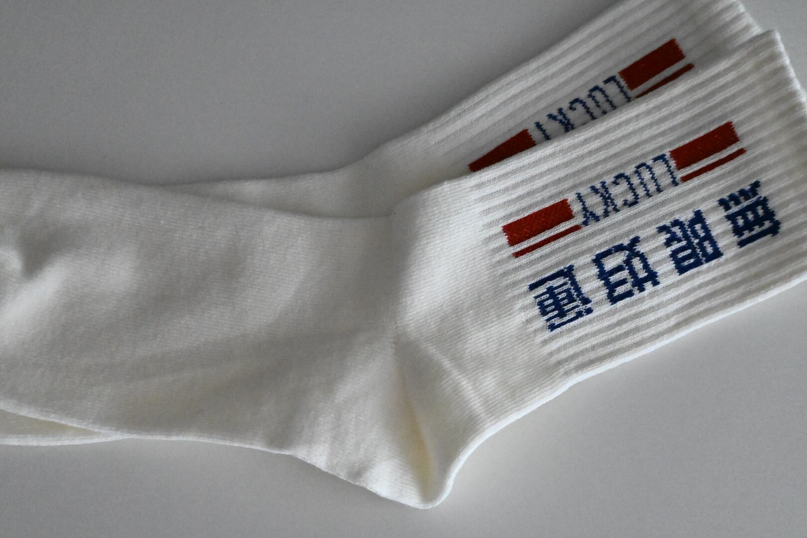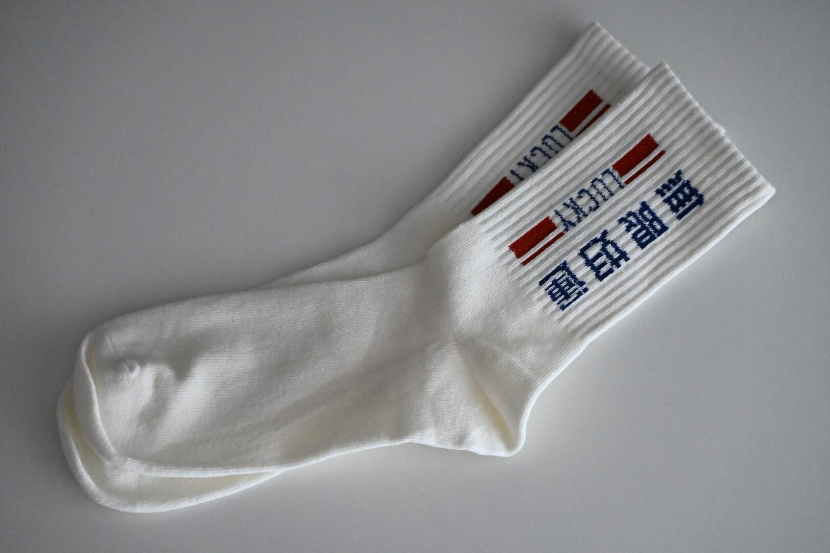 【無限好運 LUCKY】という、履いたらなんだか良いことがありそうなメッセージが書かれた靴下。