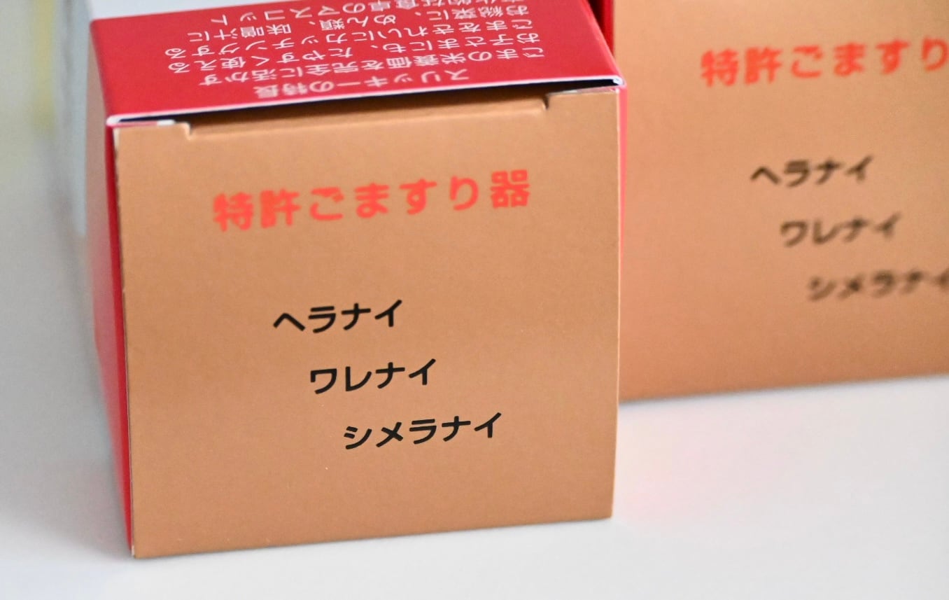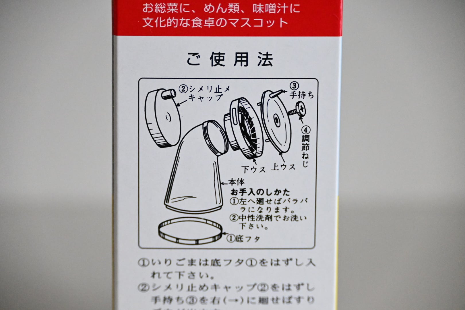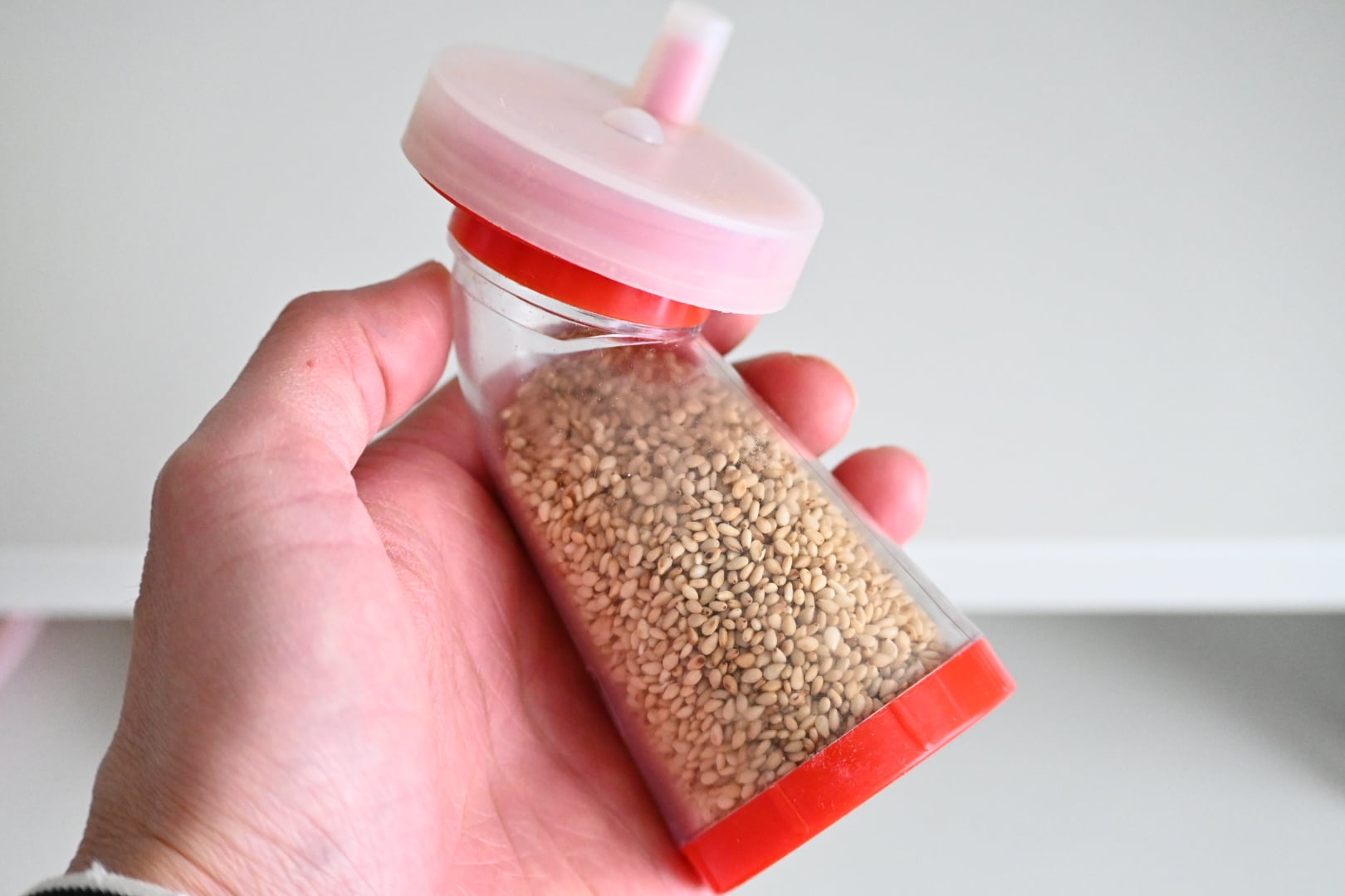 特徴ある入れ物の形になんだろう?と思いましたが、ゴマが入っていたので「ああこれでゴマをかけてくださいねということなのだ」と理解しました。