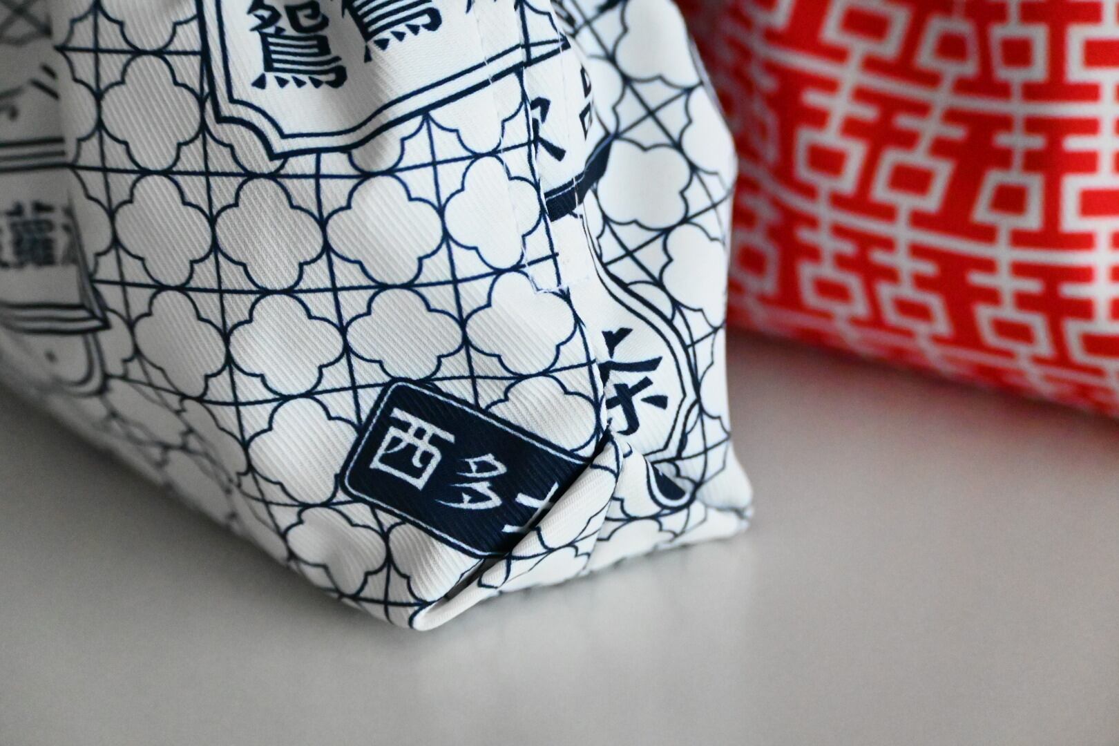 赤色の生地に白い「囍」の文字がデザインされた個人的に大好きな生地です。裏地も紐も赤色で統一しています。