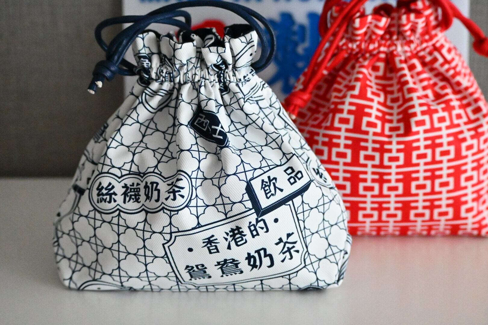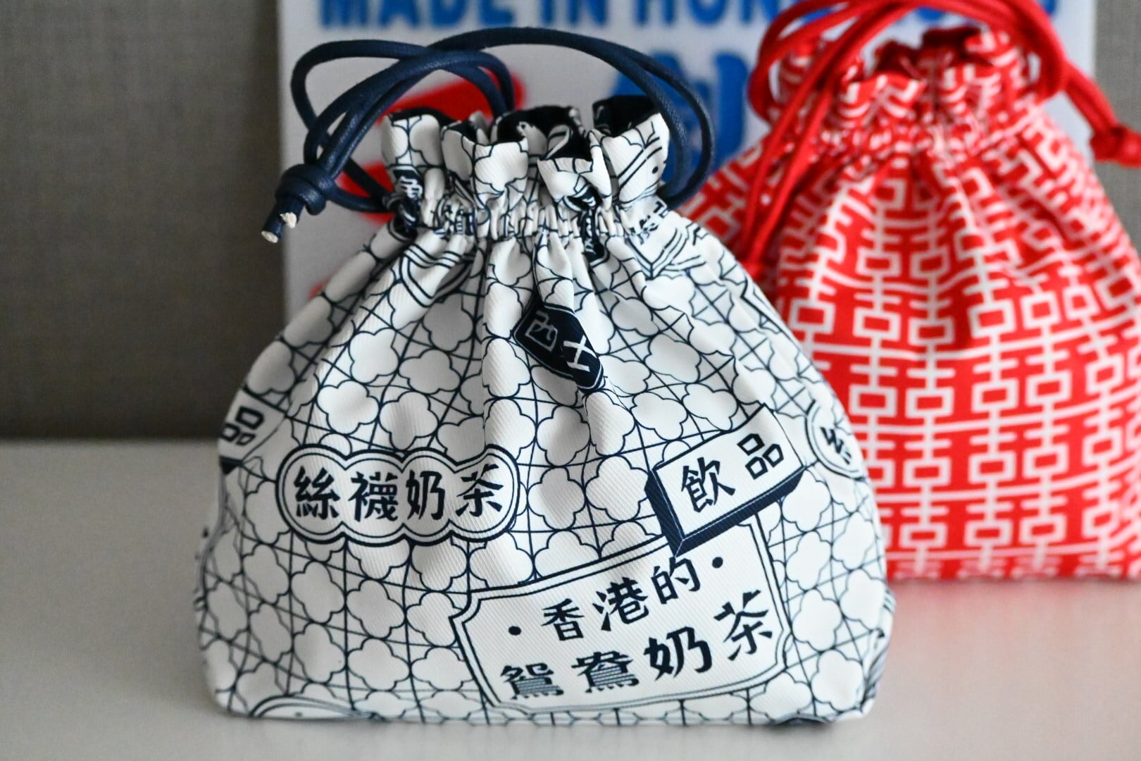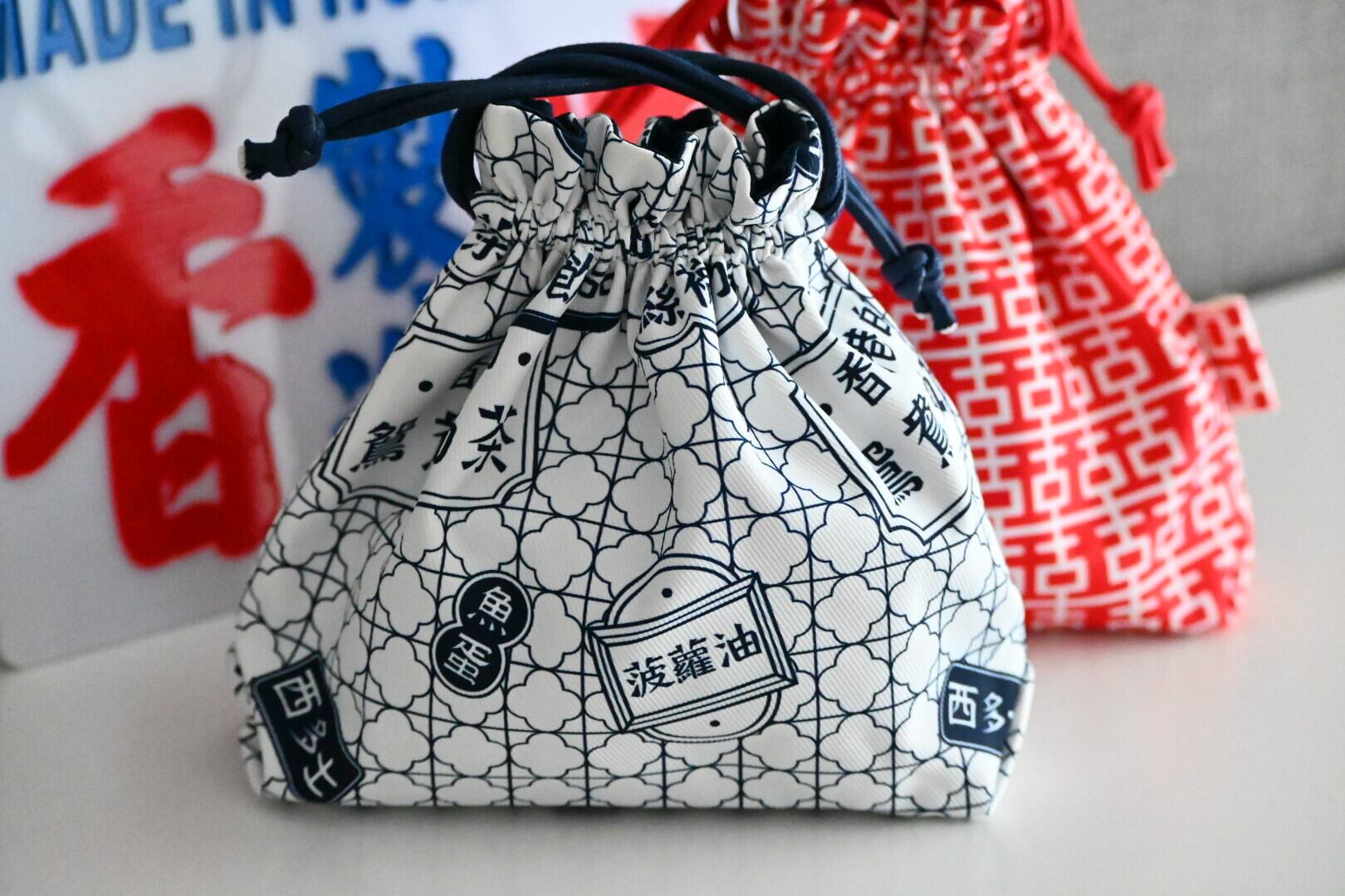 香港の生地で作った巾着 茶餐廳のメニュー柄