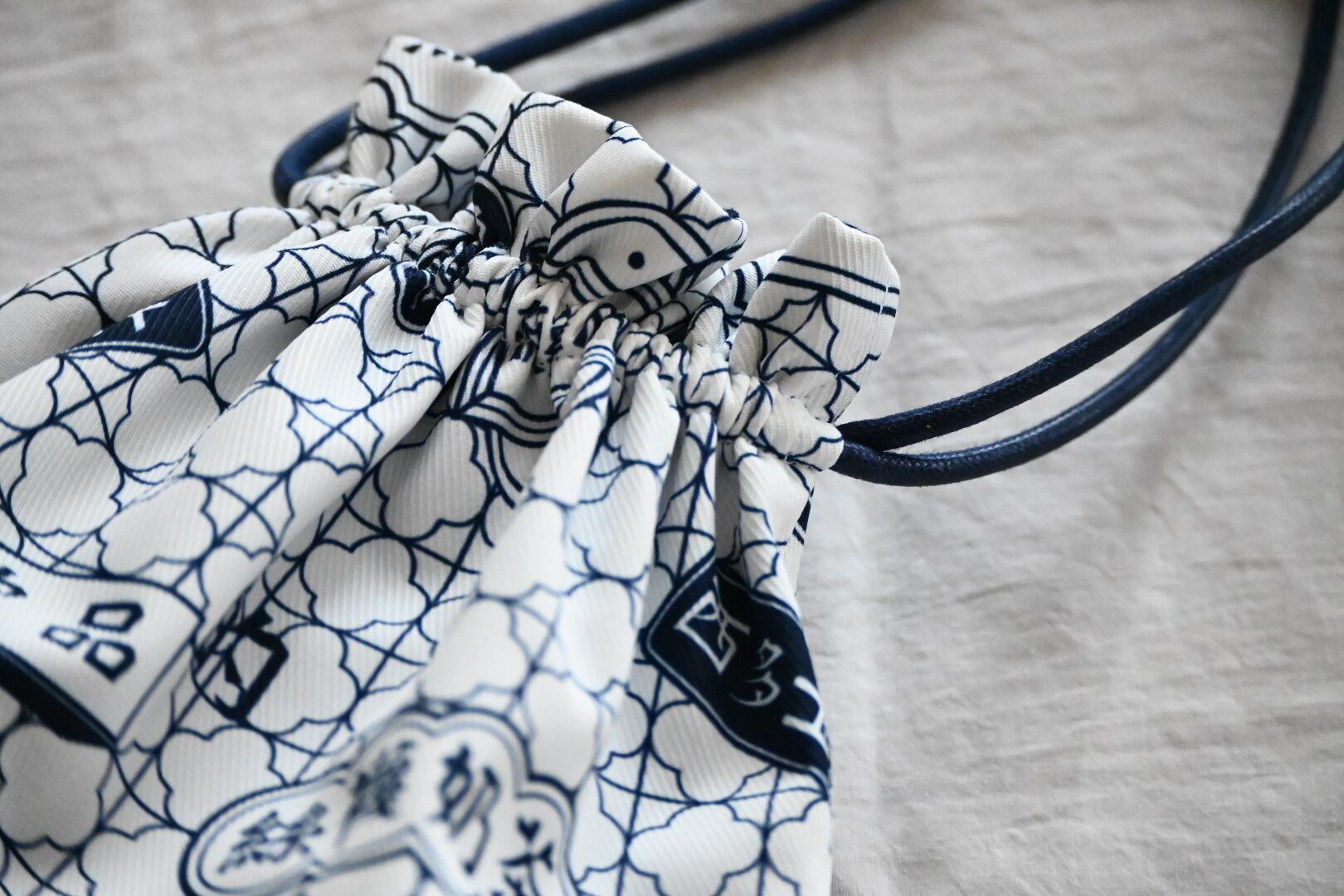 この巾着はサンプルを2年前に作って以来愛用していて、私は普段この中に折りたたんだカンフーシューズを入れて持ち歩いています。