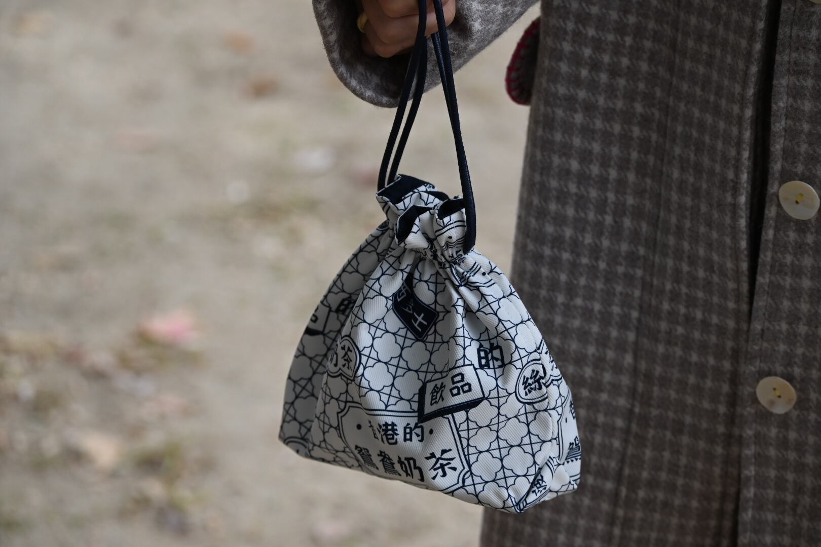 白の生地に紺色で香港の茶餐廳で見かける食べ物の名前がデザインされています。裏地と紐も紺色です。