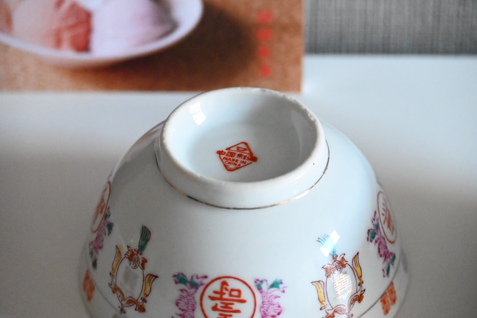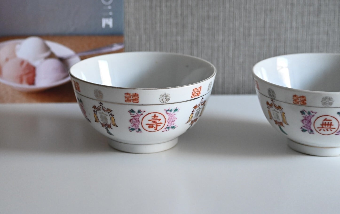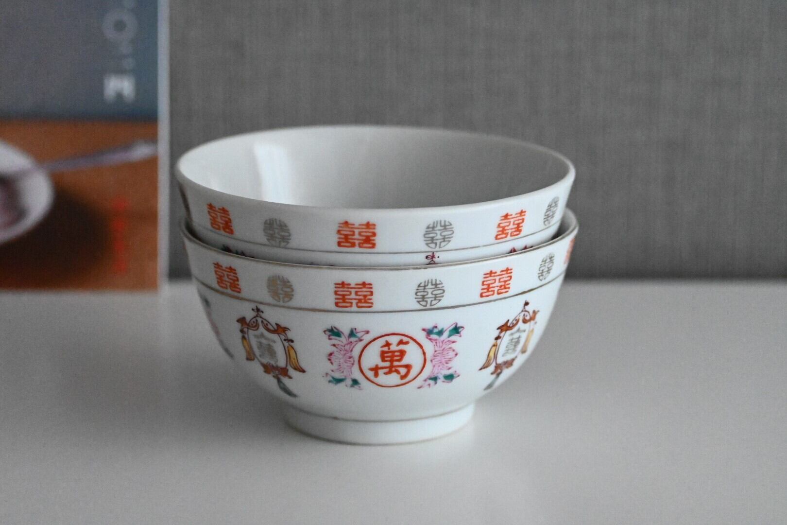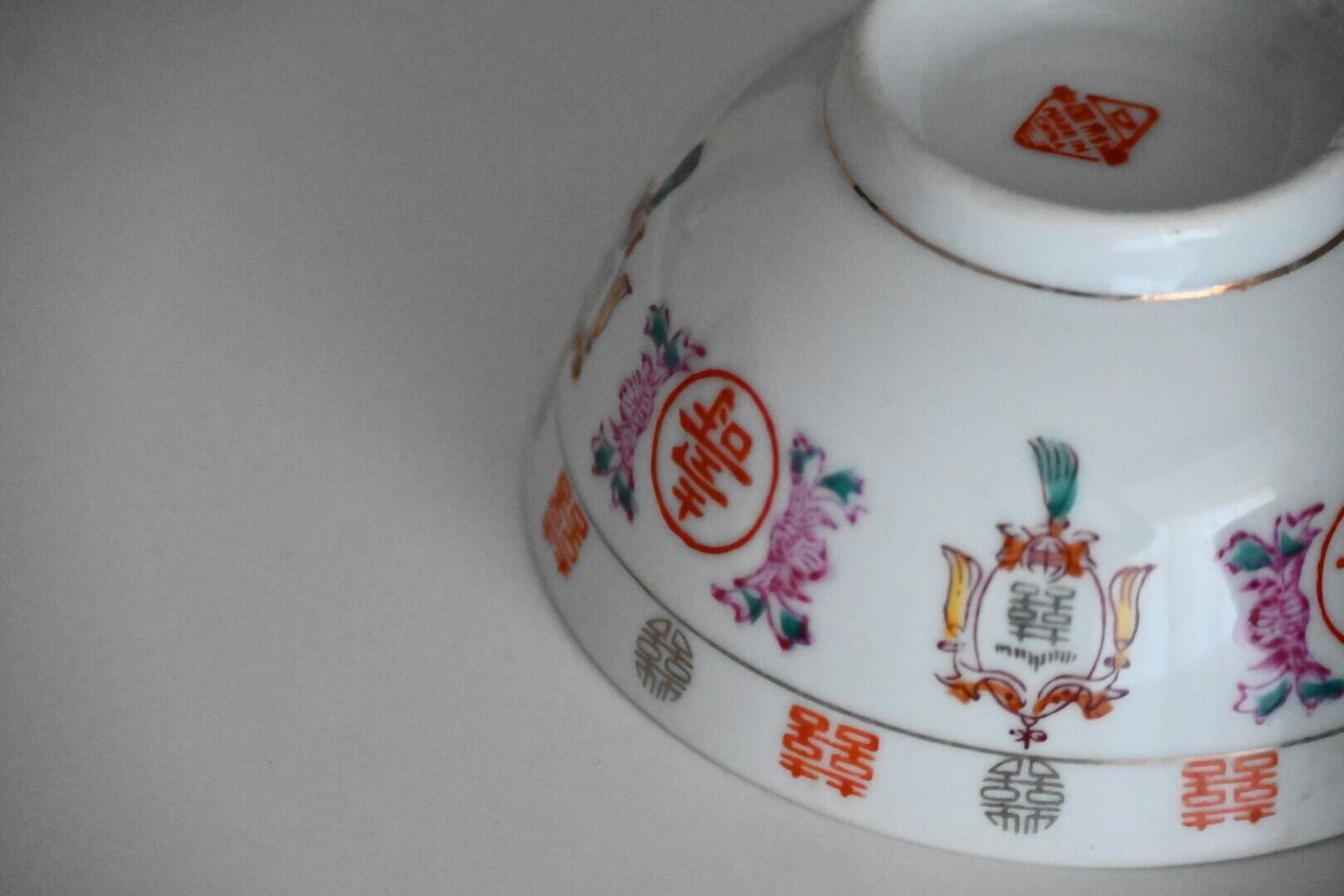 器の上部にはぐるっと一周、赤と、シルバーにも見える金で囍の文字が並び、その下には萬・壽・無・疆の4文字が赤丸の中に書かれています。色の使い方と余白に品があるのがとても気に入って、状態の良いものを少しだけ持ち帰りました。
