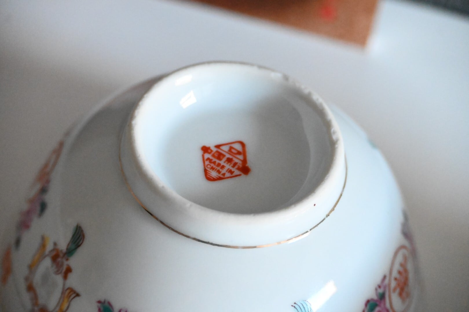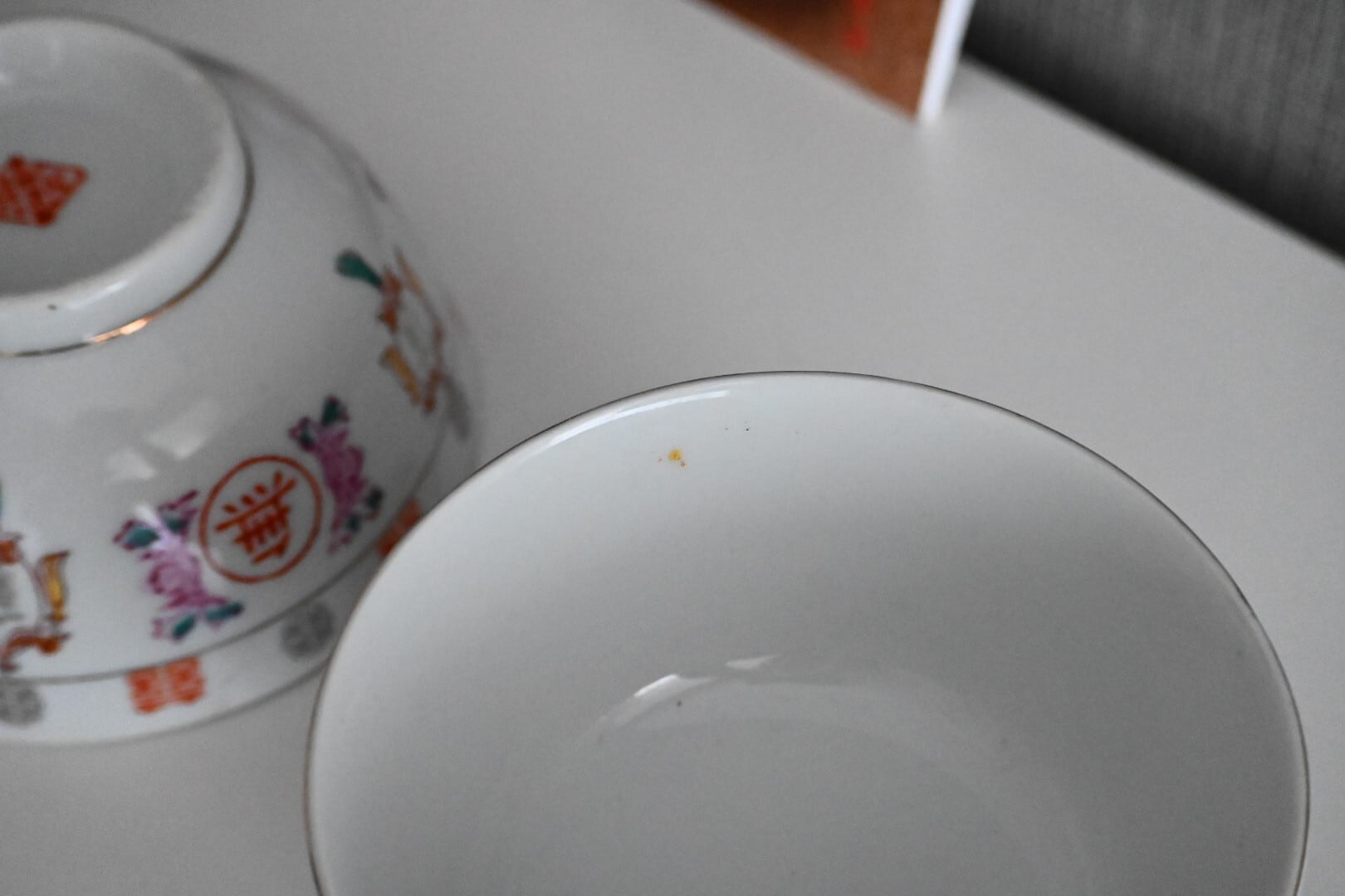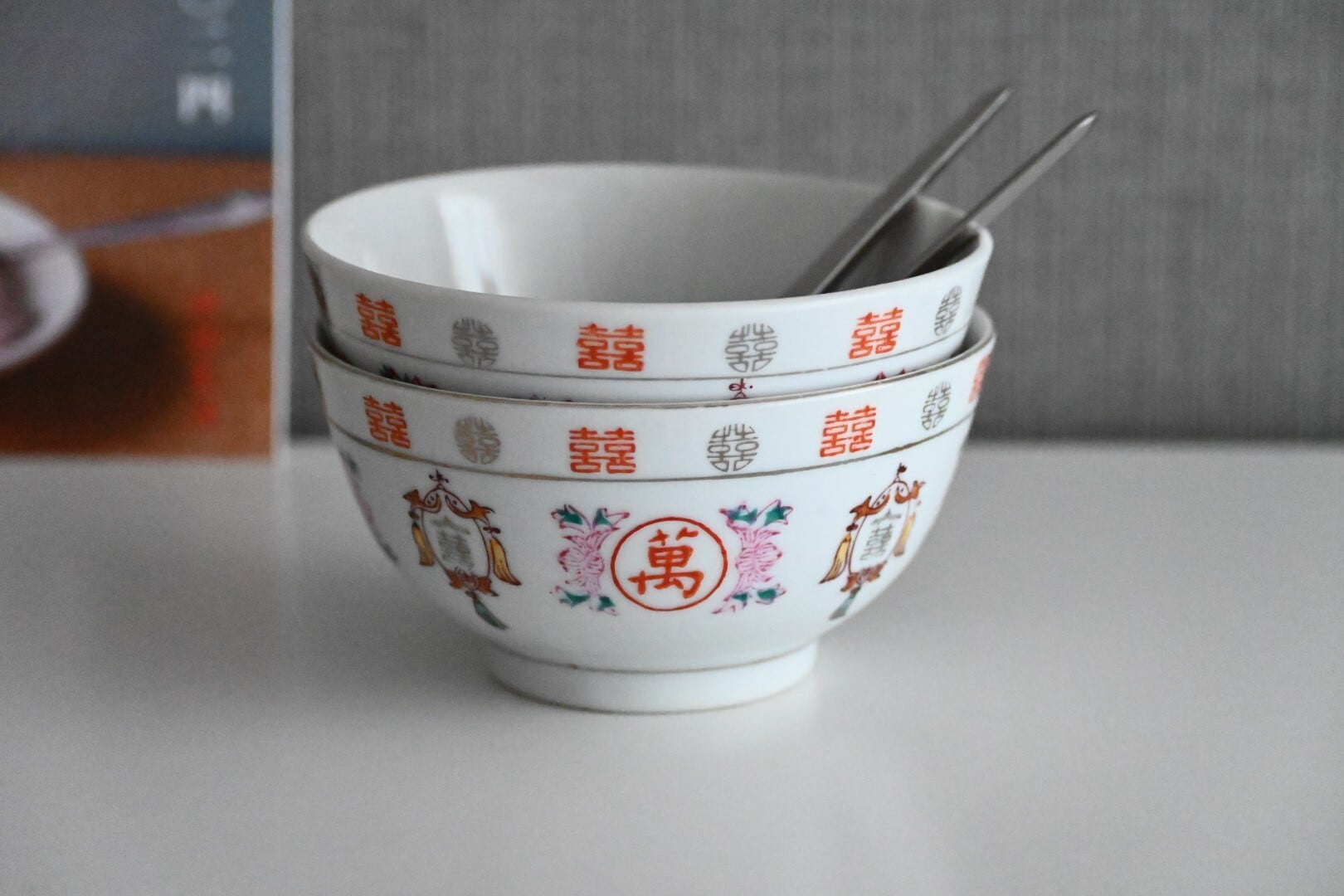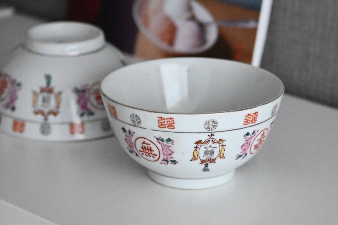器の上部にはぐるっと一周、赤と、シルバーにも見える金で囍の文字が並び、その下には萬・壽・無・疆の4文字が赤丸の中に書かれています。色の使い方と余白に品があるのがとても気に入って、状態の良いものを少しだけ持ち帰りました。