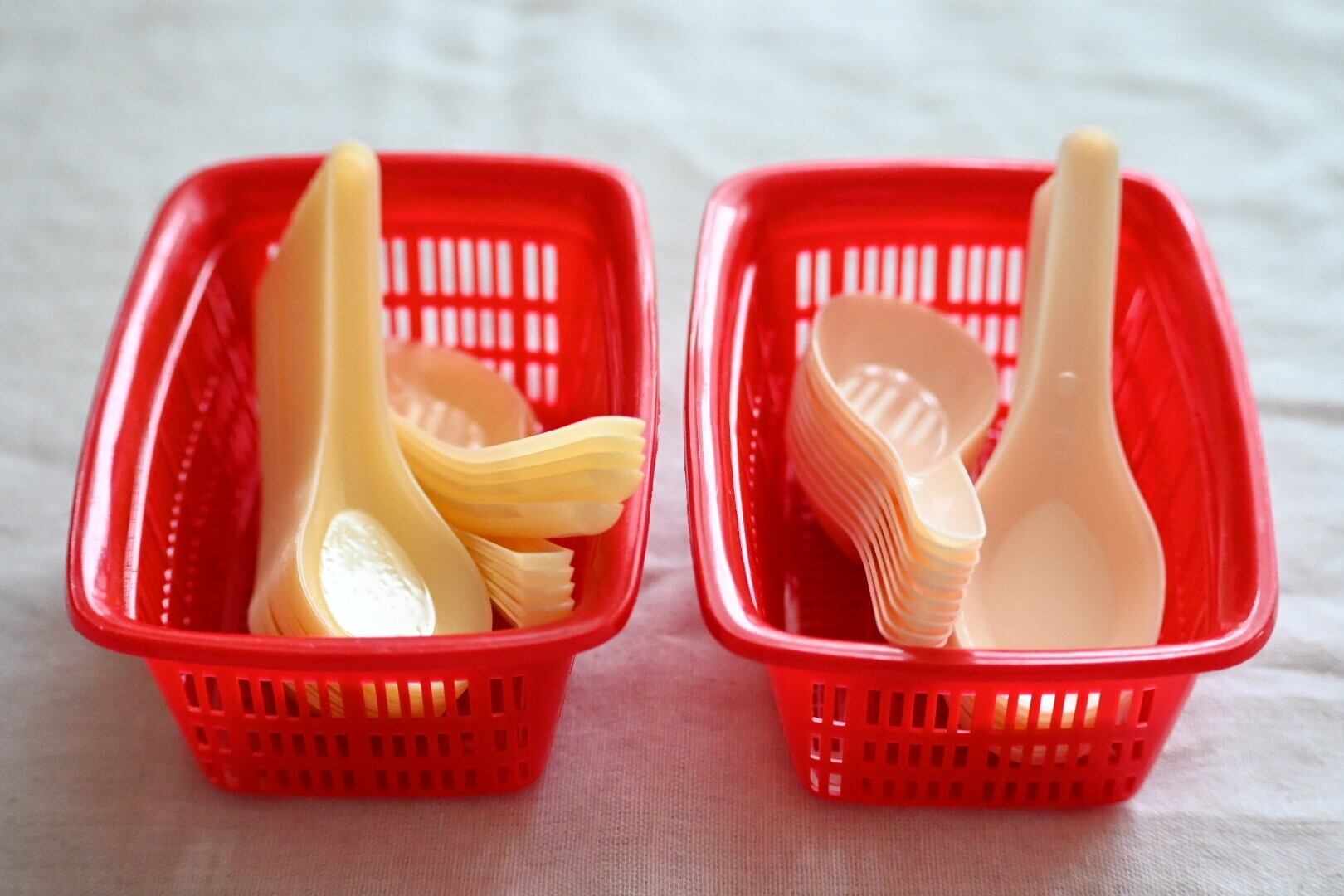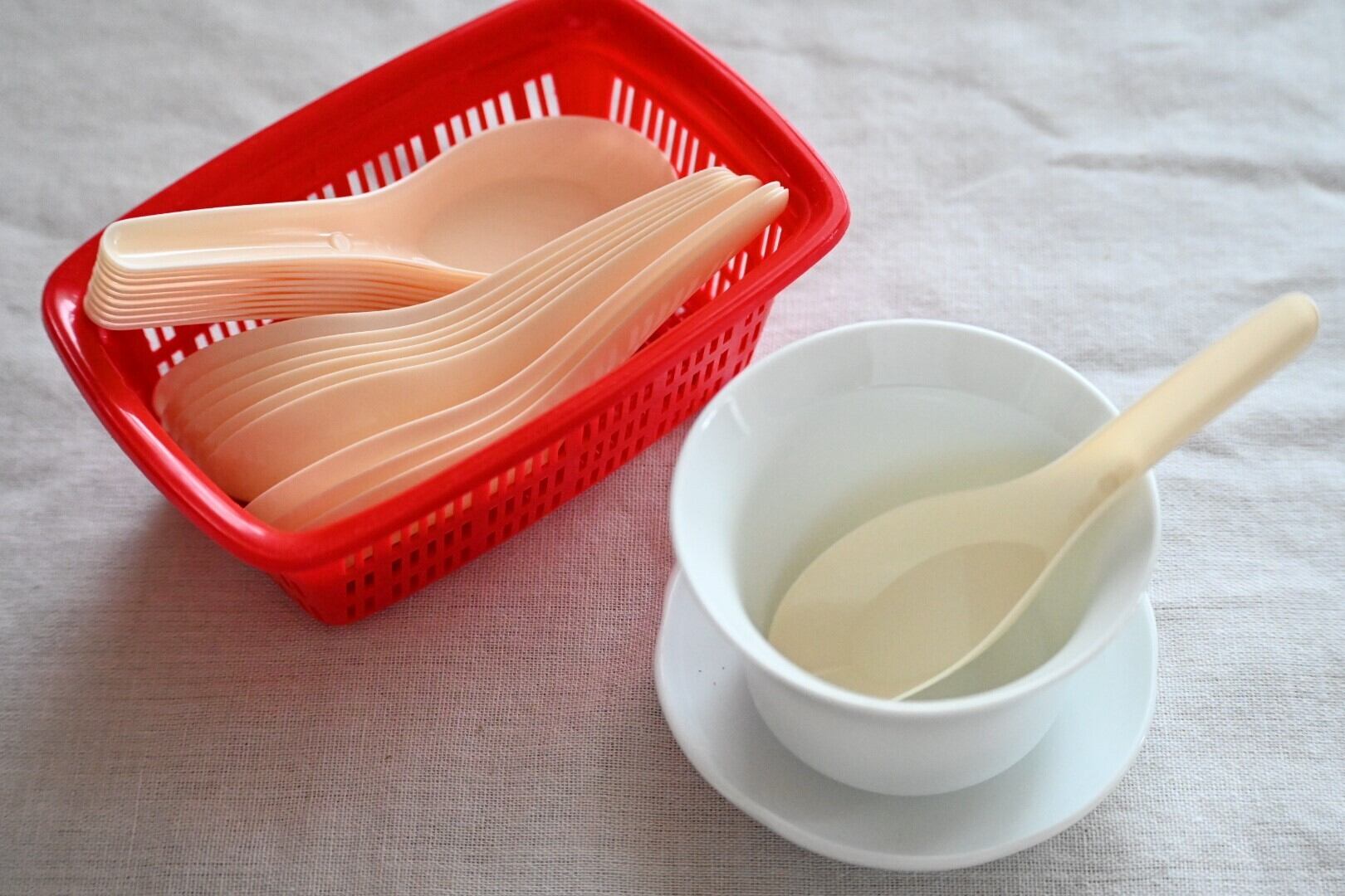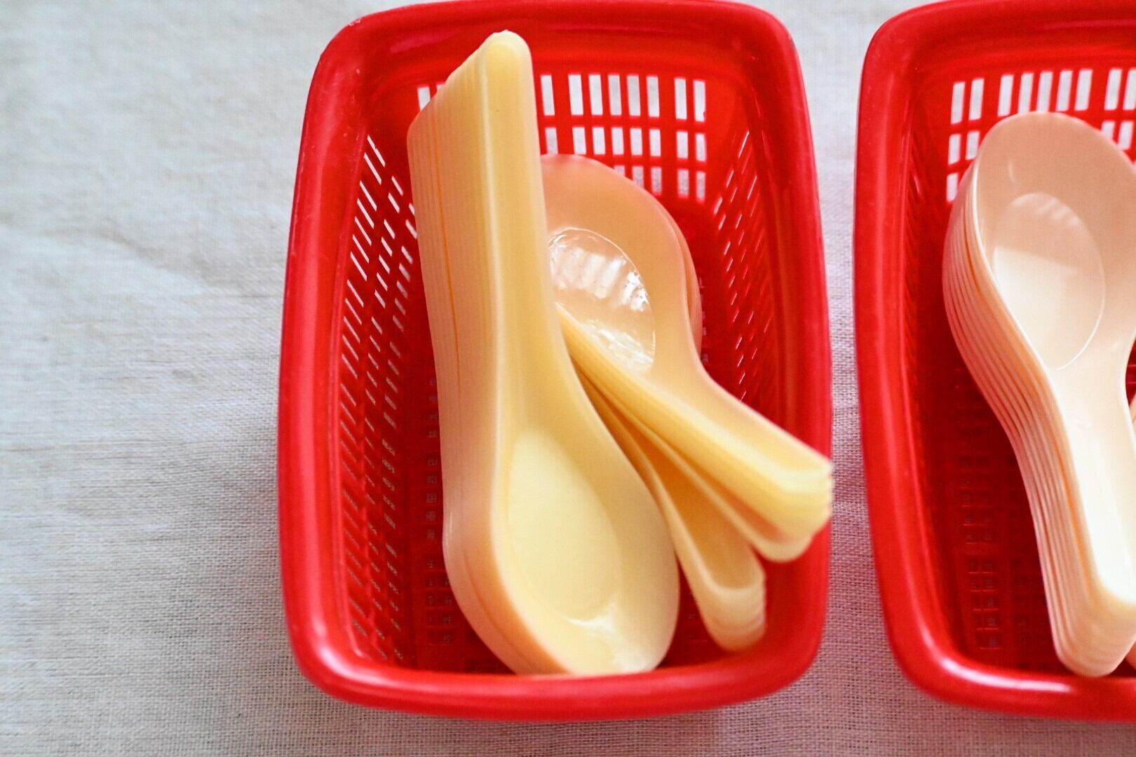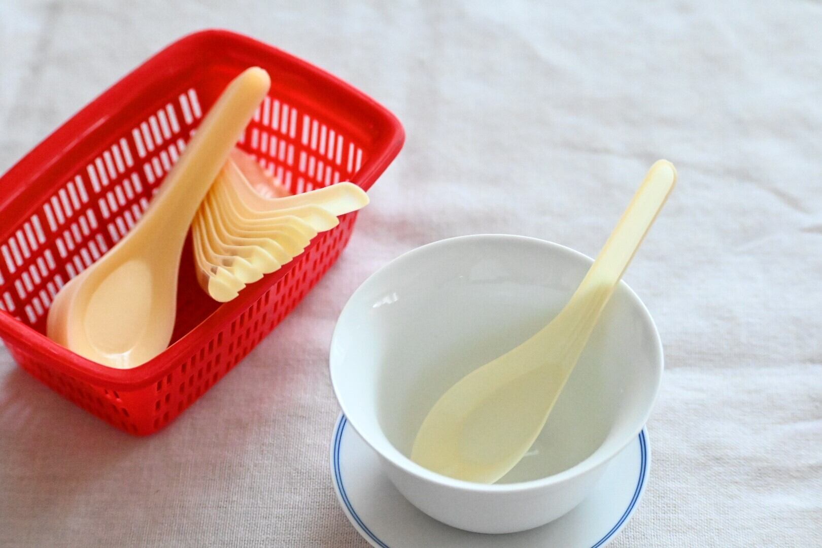 香港でテイクアウトの食べ物を注文すると、たいていの場合こういうレンゲをつけてくれます。豆花屋さんのように、ぱっと食べるようなもののお店でも、店内飲食の際このタイプのレンゲがついてくることがあります。