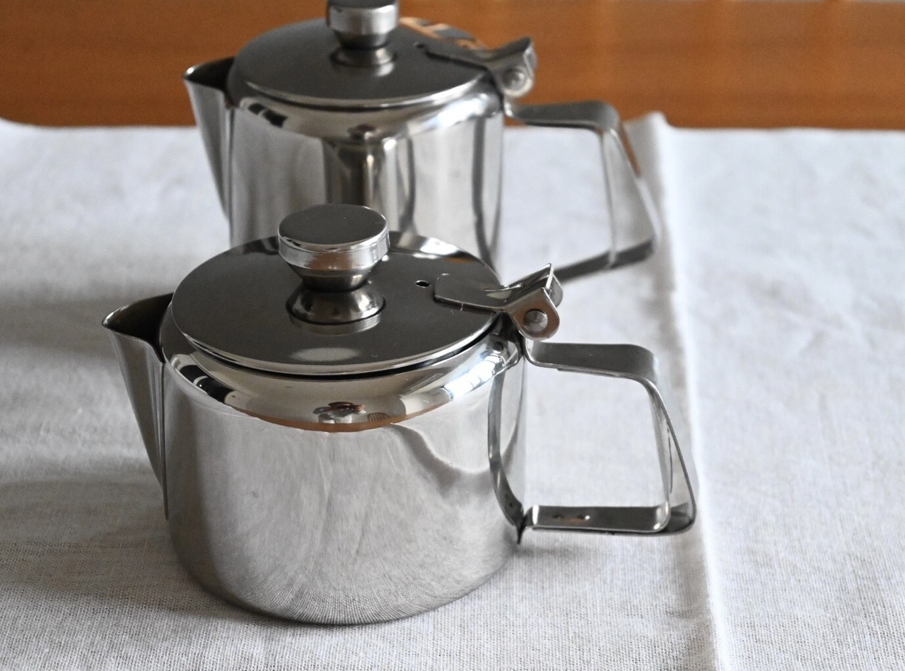 みなさんにとてもご好評いただいている「ステンレスポット」と同じメーカーの、旧型のポットです。底面が広いこちらのポット、香港ではティーポットと呼ばれているようです。