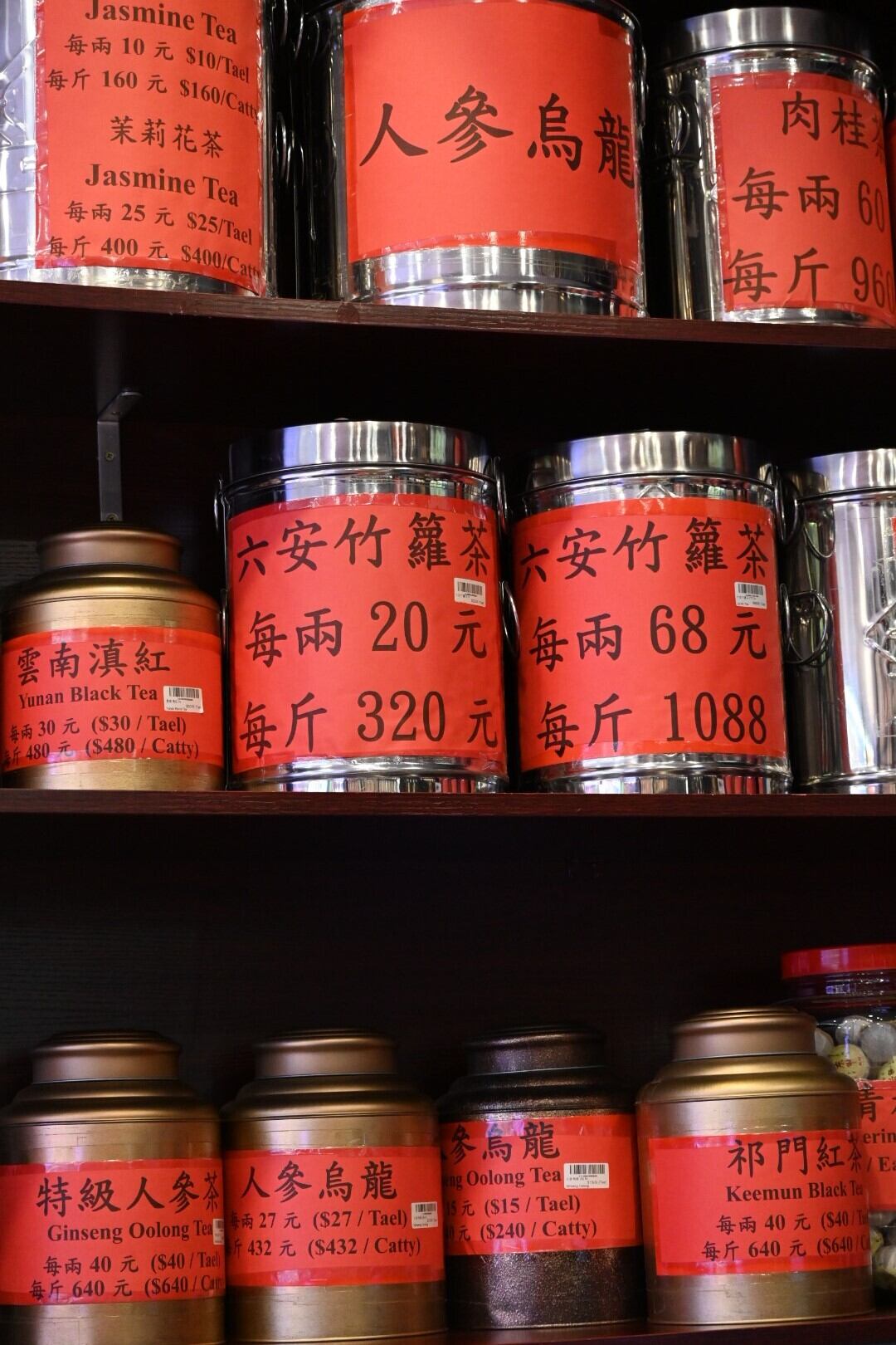 香港のお茶屋さんでは、10枚目の写真のように缶の表面いっぱいに茶葉の名前の書かれた紙が貼ってあることがほとんどなので、いつも「この缶たちのあの紙の下はどういう模様なのだろう…」と気になっていました。なのでこの缶を見つけた時はとても嬉しくて、でも見つけた物は埃をたくさん被っていたので、倉庫から新しいものを持ってきてもらい持ち帰ってきました。