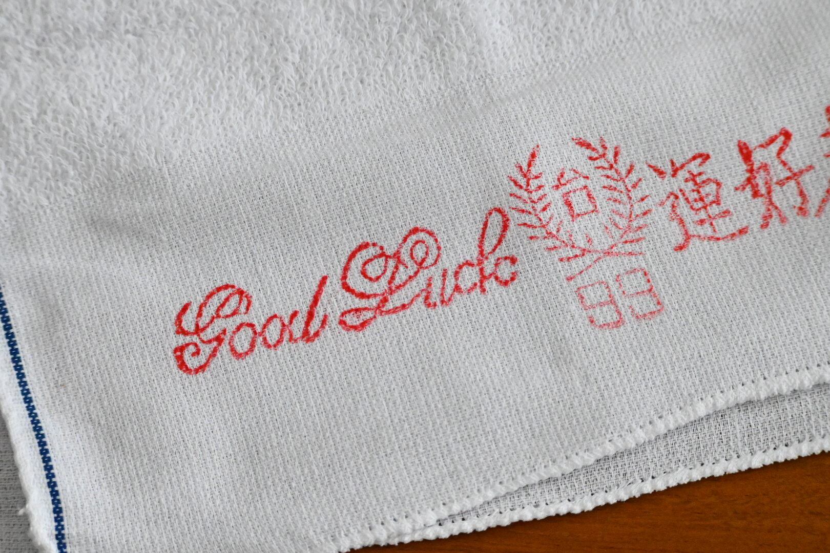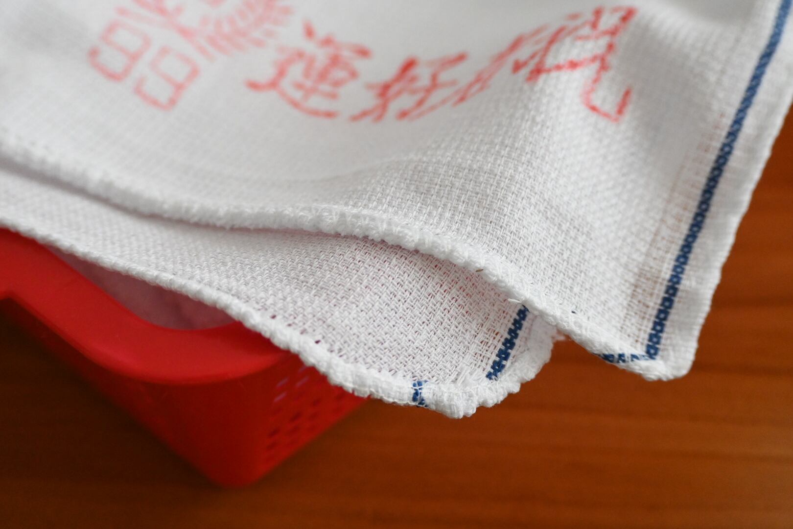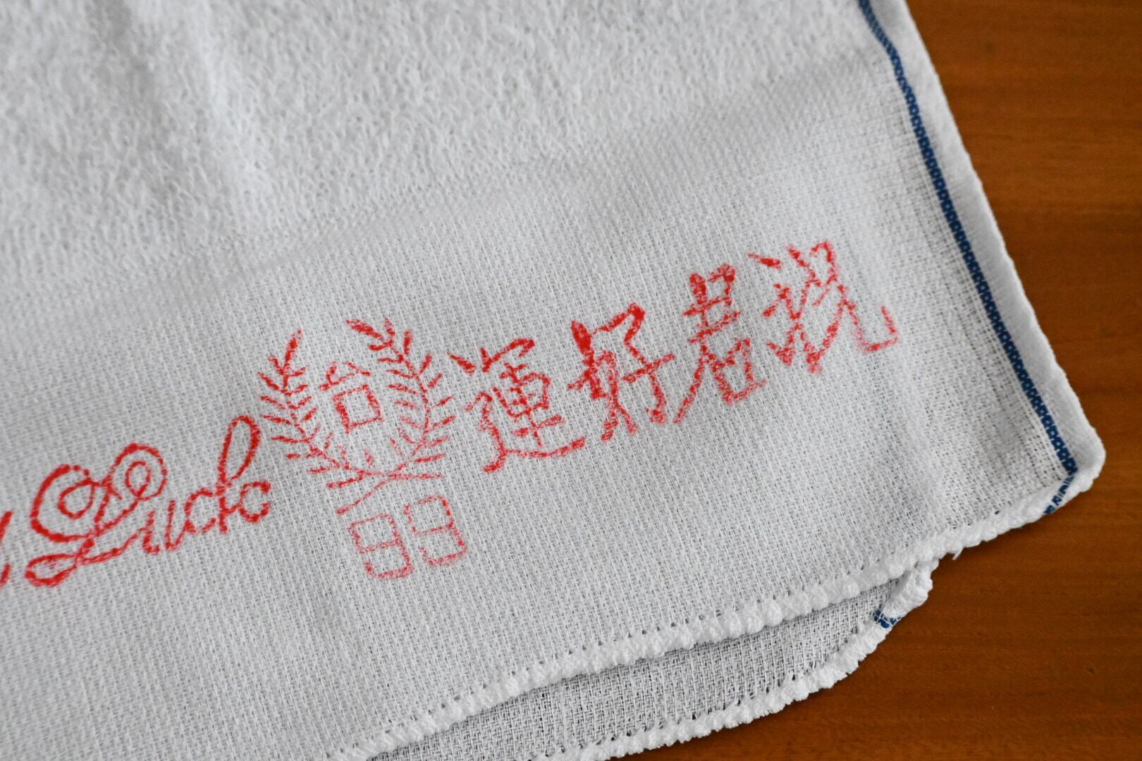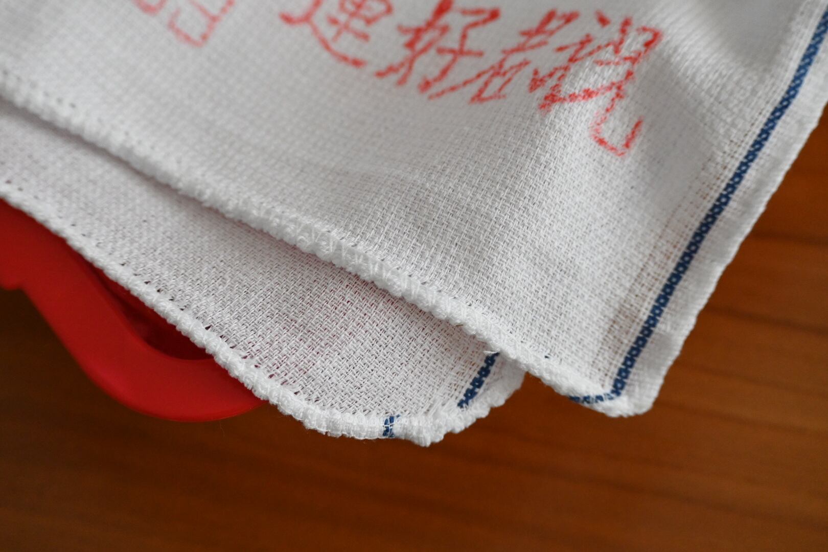 まず気に入ったのは赤い文字がクレヨンで書いたみたいに少し掠れていること。個体差はあり、印刷が濃いもの、薄いものがあるのですが、濃いものも薄いものも文字が少し掠れている。なんだか雰囲気があっていいじゃないか、と持ち帰ってくる言い訳を自分に作りました。それから端の処理が比較的丁寧なのも、良いなと思ったポイントです。もしかすると今在庫のあるタオルたちの中で、端の処理は一番丁寧かもしれません。