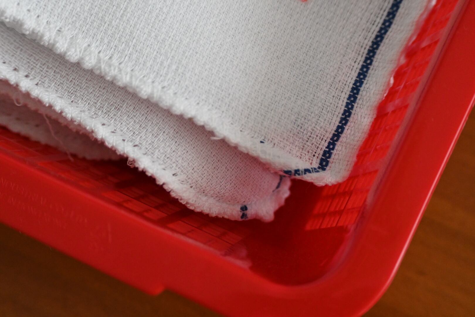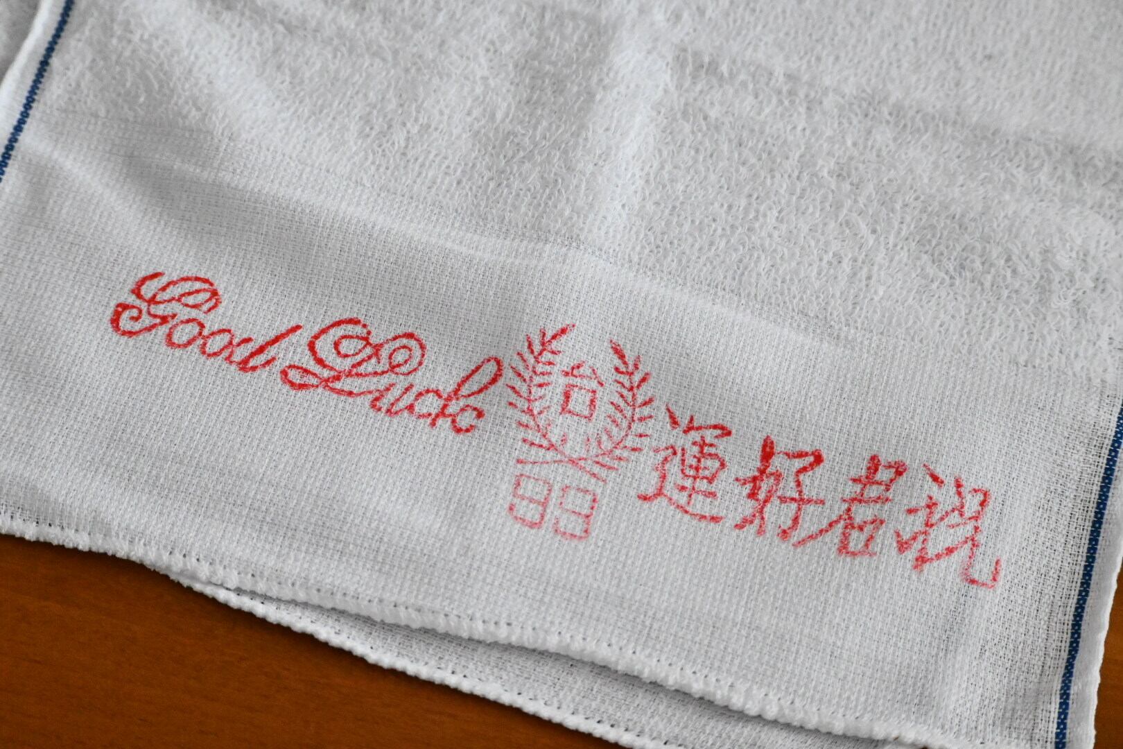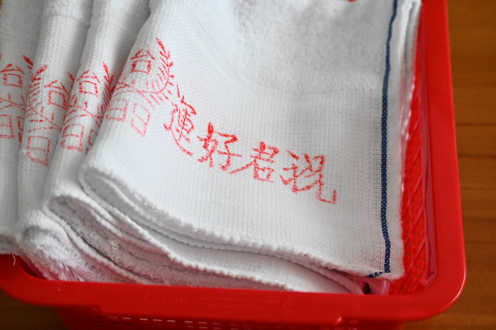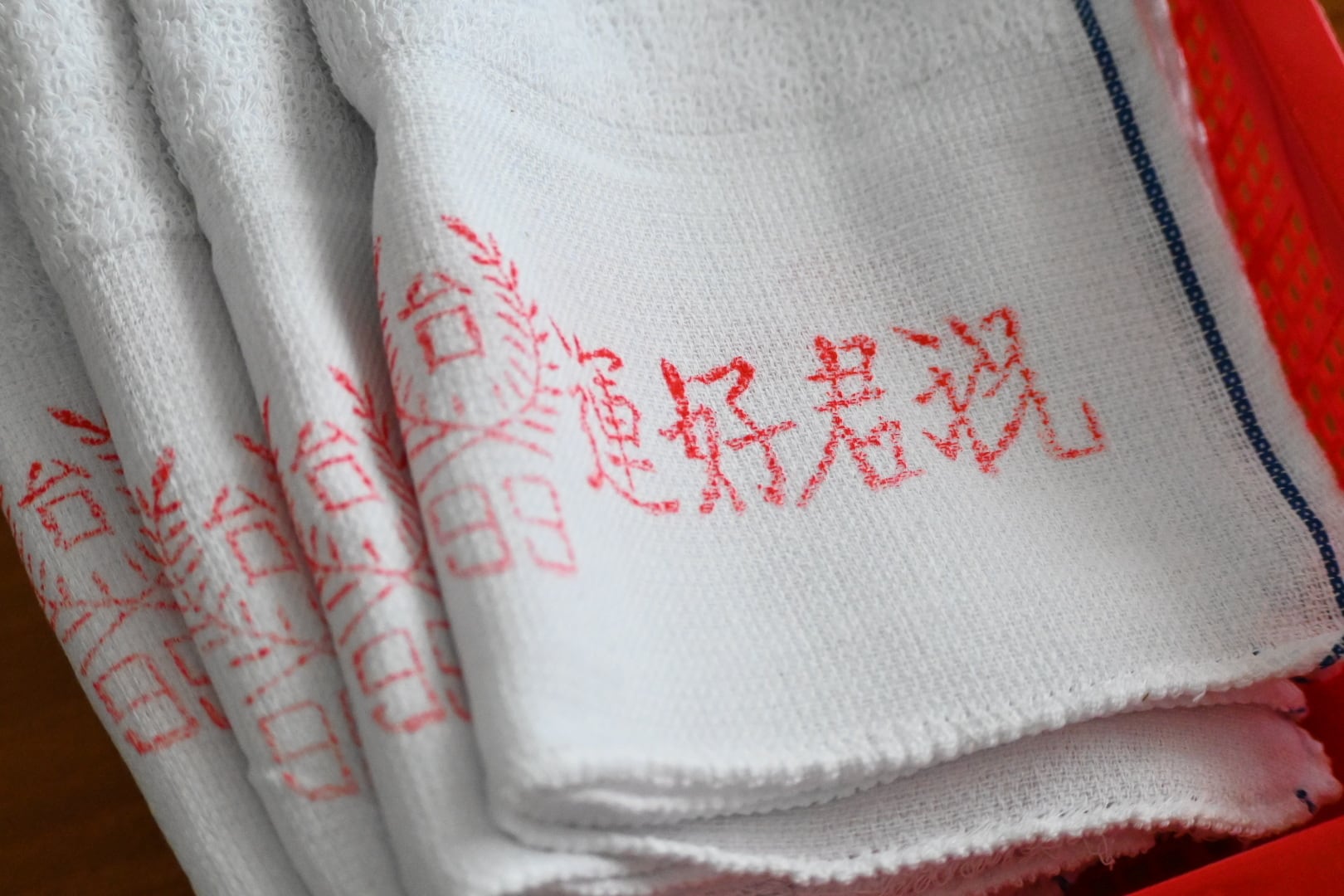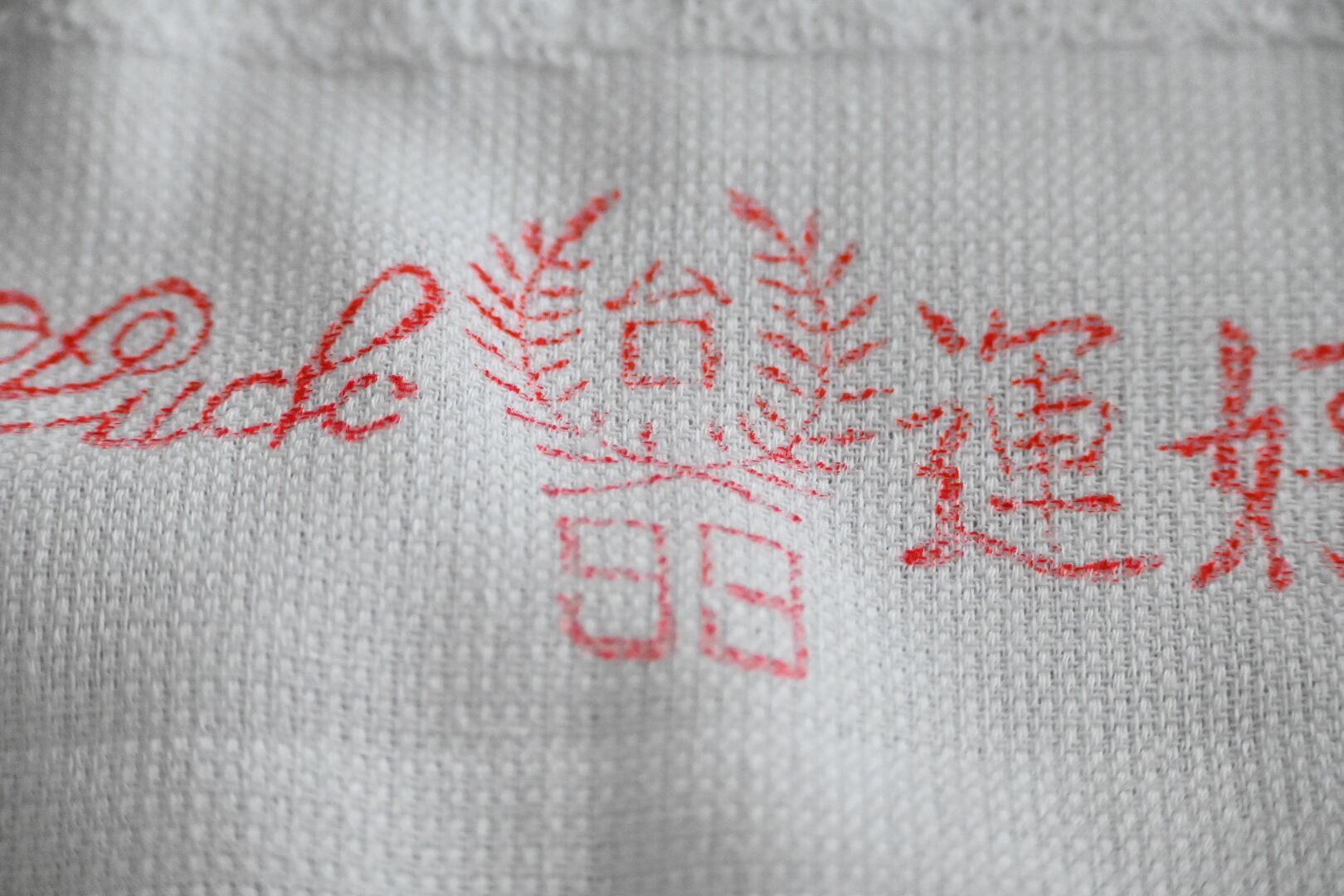 まず気に入ったのは赤い文字がクレヨンで書いたみたいに少し掠れていること。個体差はあり、印刷が濃いもの、薄いものがあるのですが、濃いものも薄いものも文字が少し掠れている。なんだか雰囲気があっていいじゃないか、と持ち帰ってくる言い訳を自分に作りました。それから端の処理が比較的丁寧なのも、良いなと思ったポイントです。もしかすると今在庫のあるタオルたちの中で、端の処理は一番丁寧かもしれません。