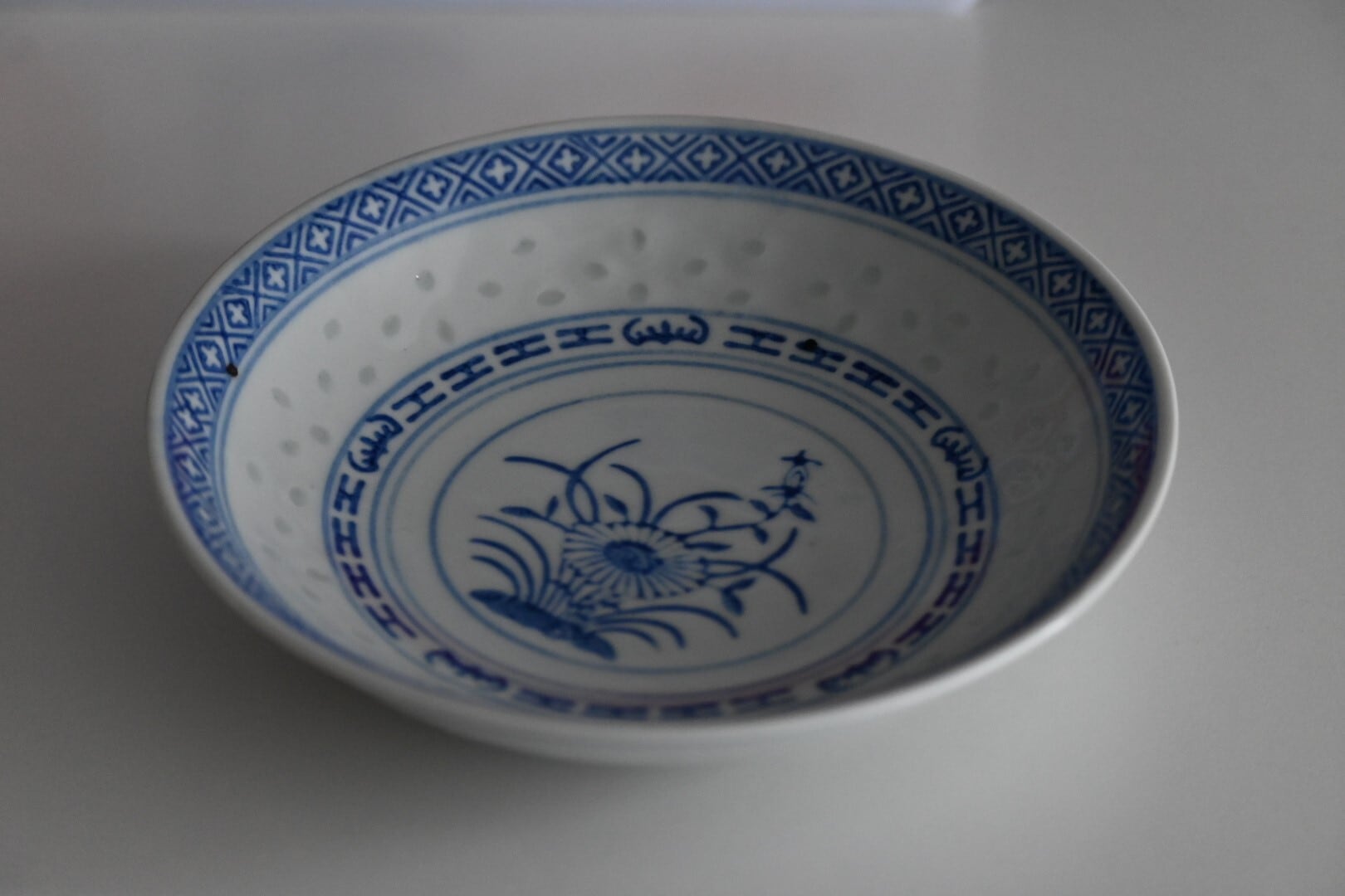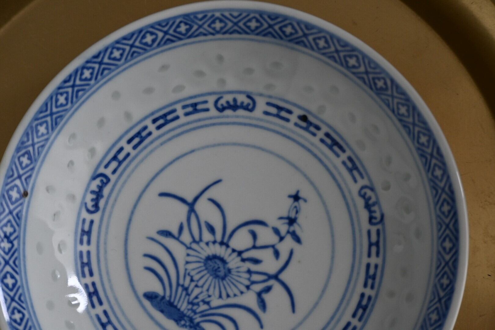 蛍手と呼ばれる、素地を透かし彫りにし、そのあとに透明の釉薬を充填して焼成する技法で作られたものですが、透かし彫り部分の透け感はこの器ではほとんどありません。