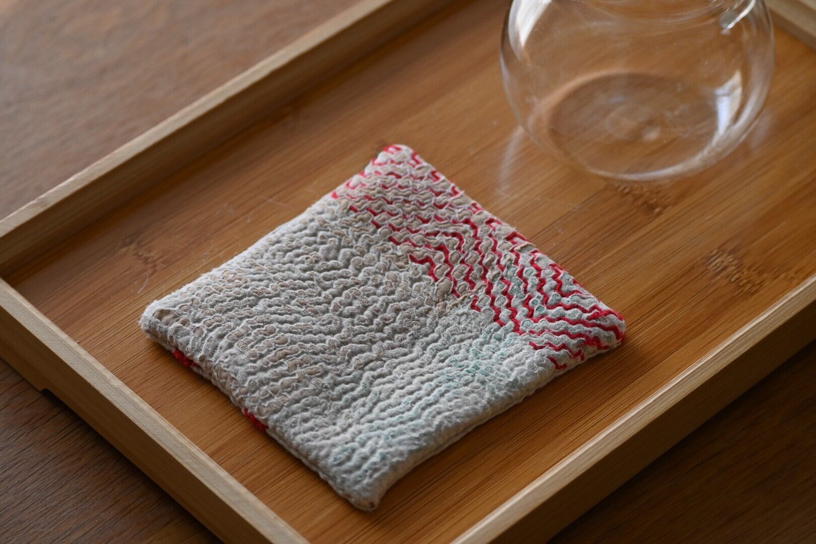 ヴィンテージのカンタキルトの端切れを縫い合わせて作ったコースターです。