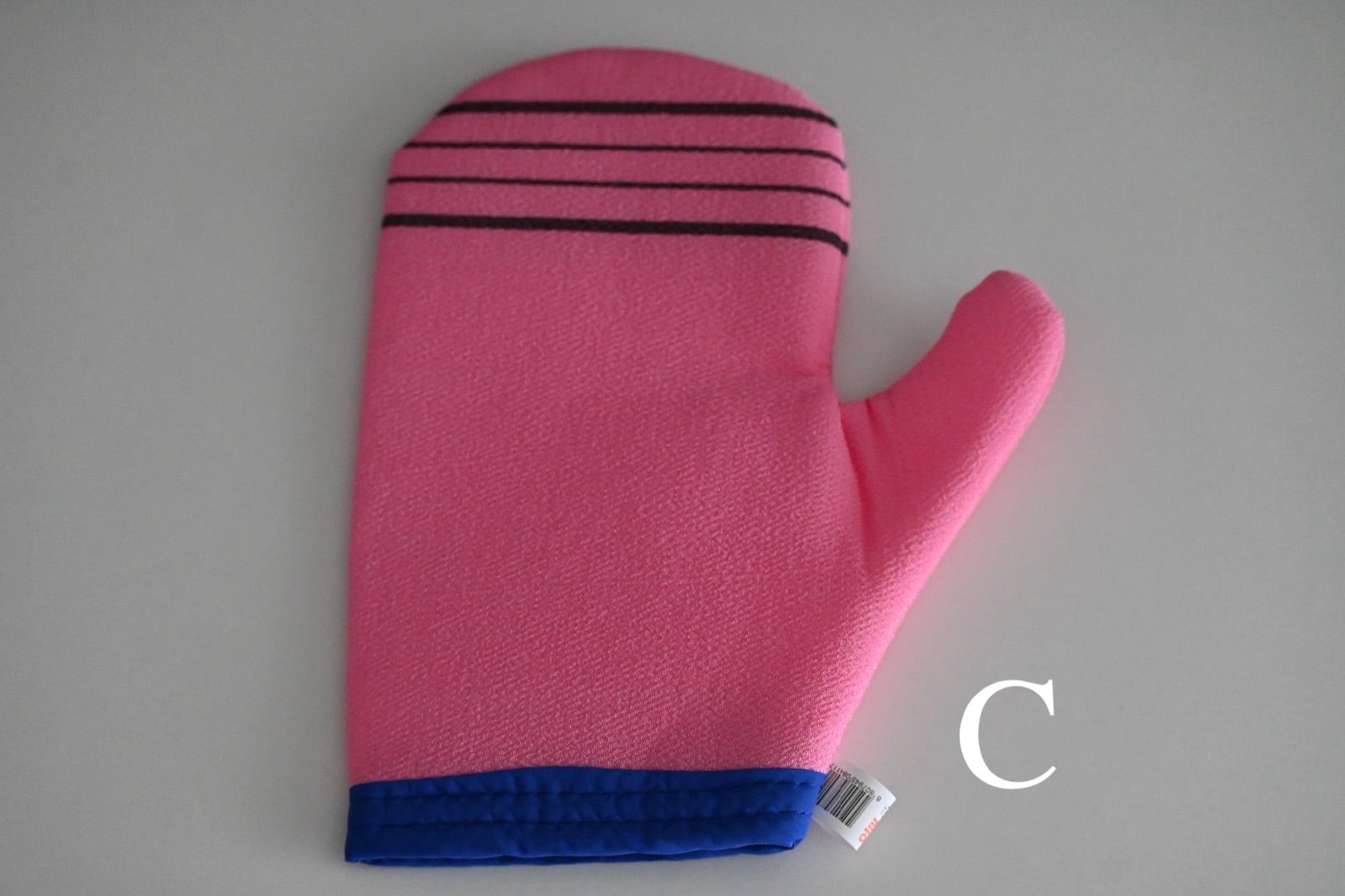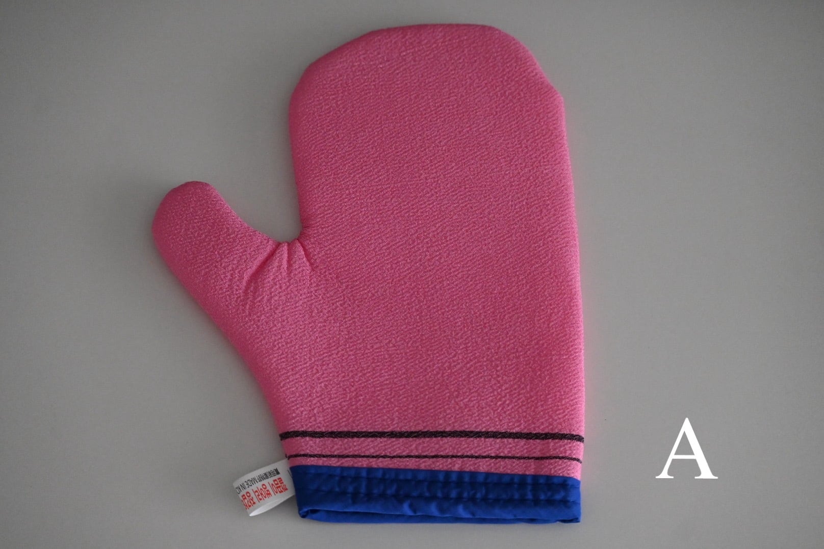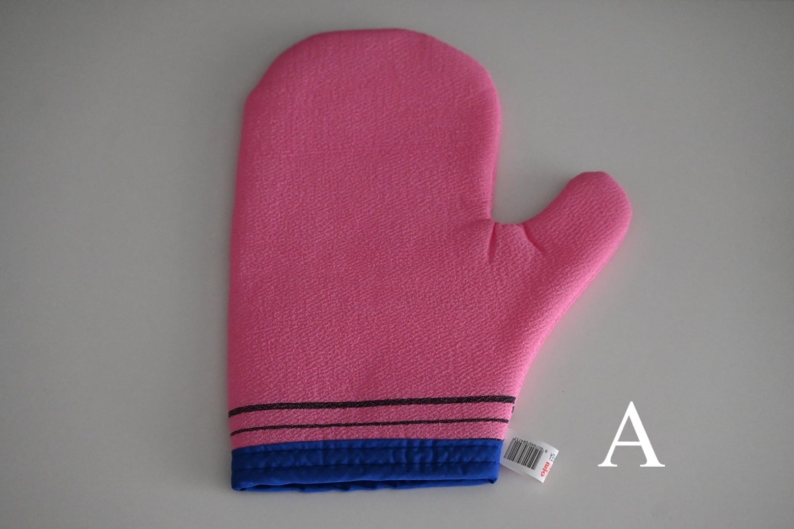 温泉タオルのサイズの長方形の垢すりタオルもありましたが、私はこの特定のピンクの手袋型の垢すりに無性に惹かれてしまい、これを見つけた小さな商店さんのスタッフさんがしばらく倉庫の奥を探してくれて、あったよあったよーといくつか持ってきてくれました。